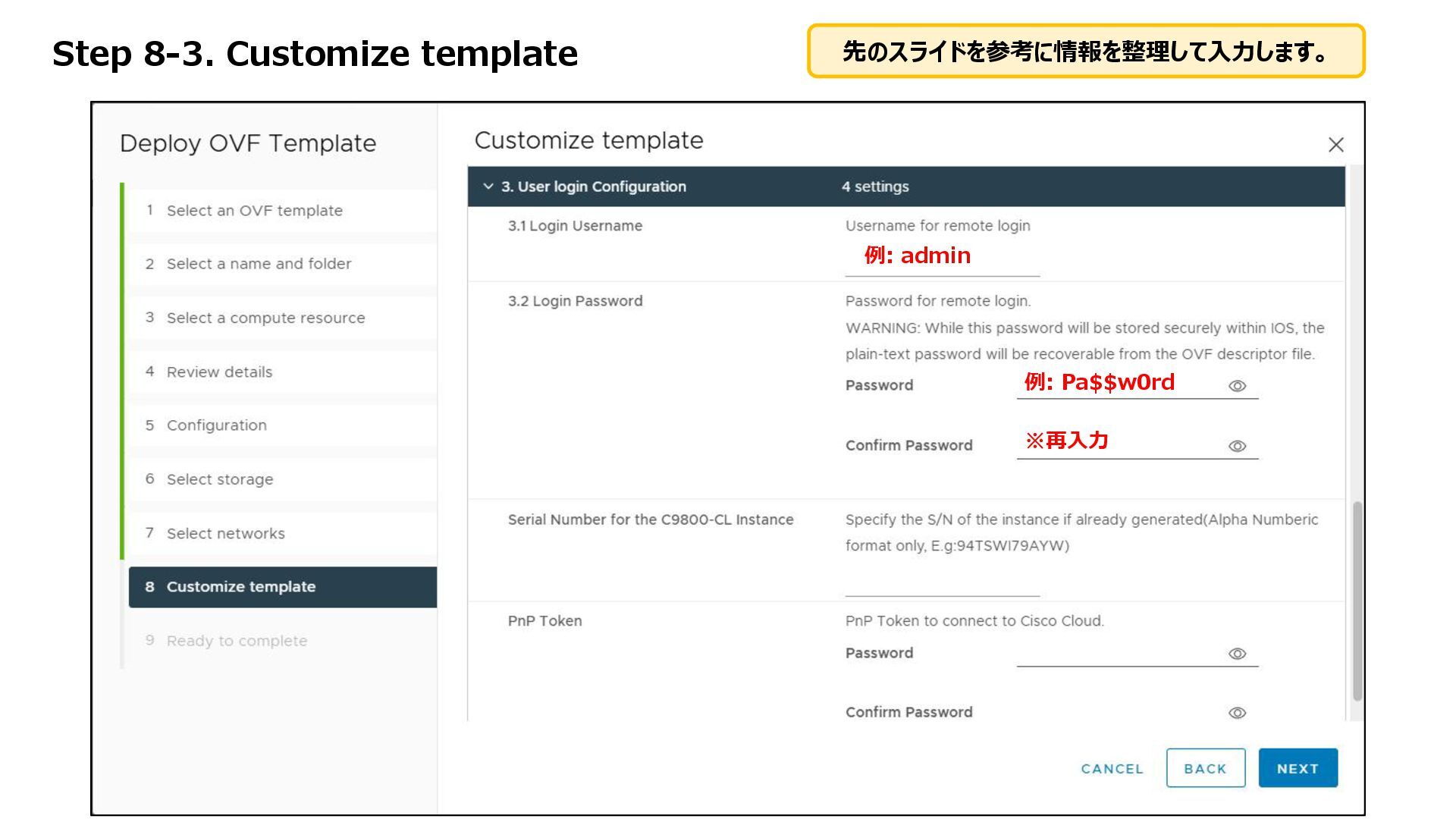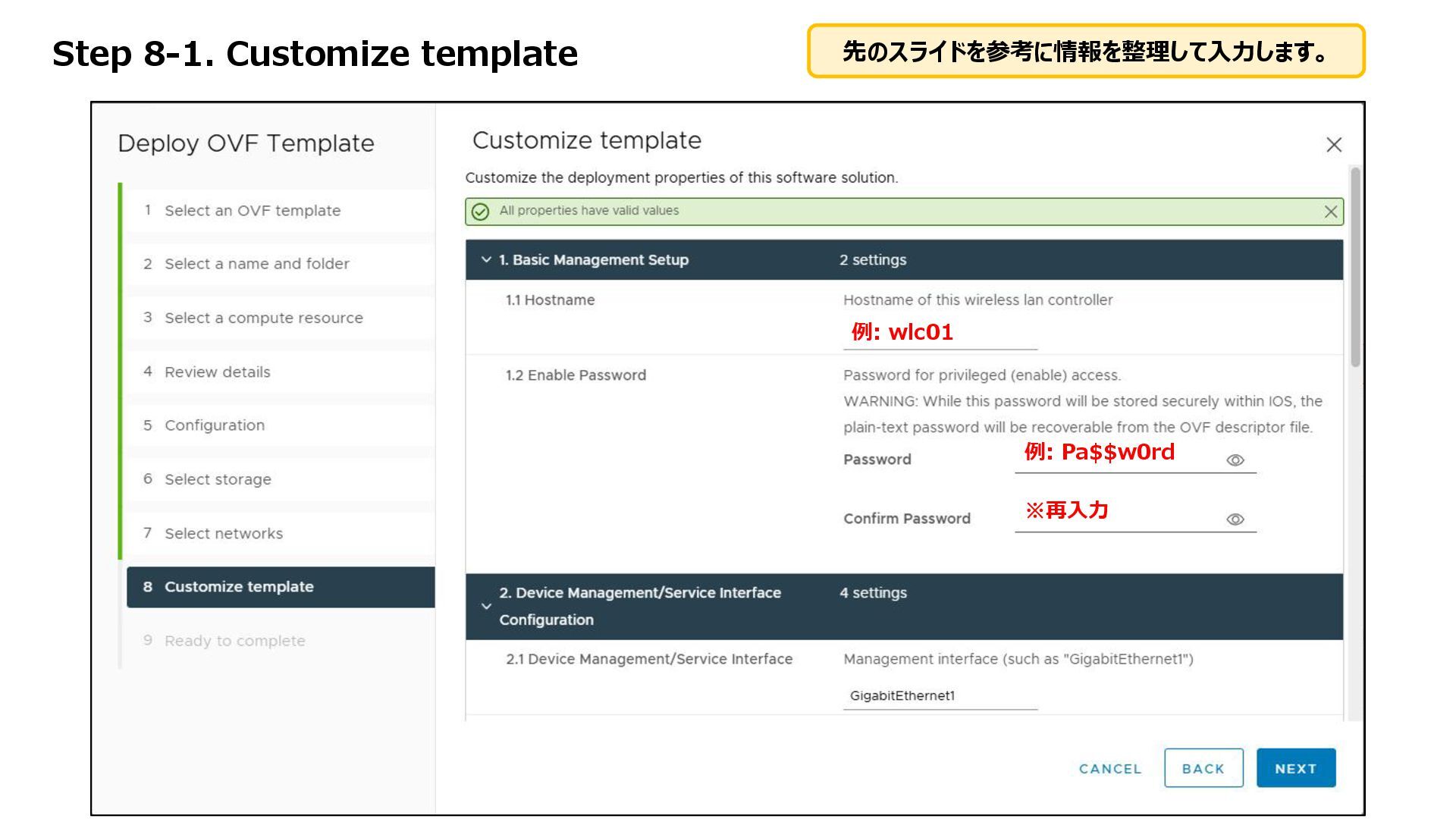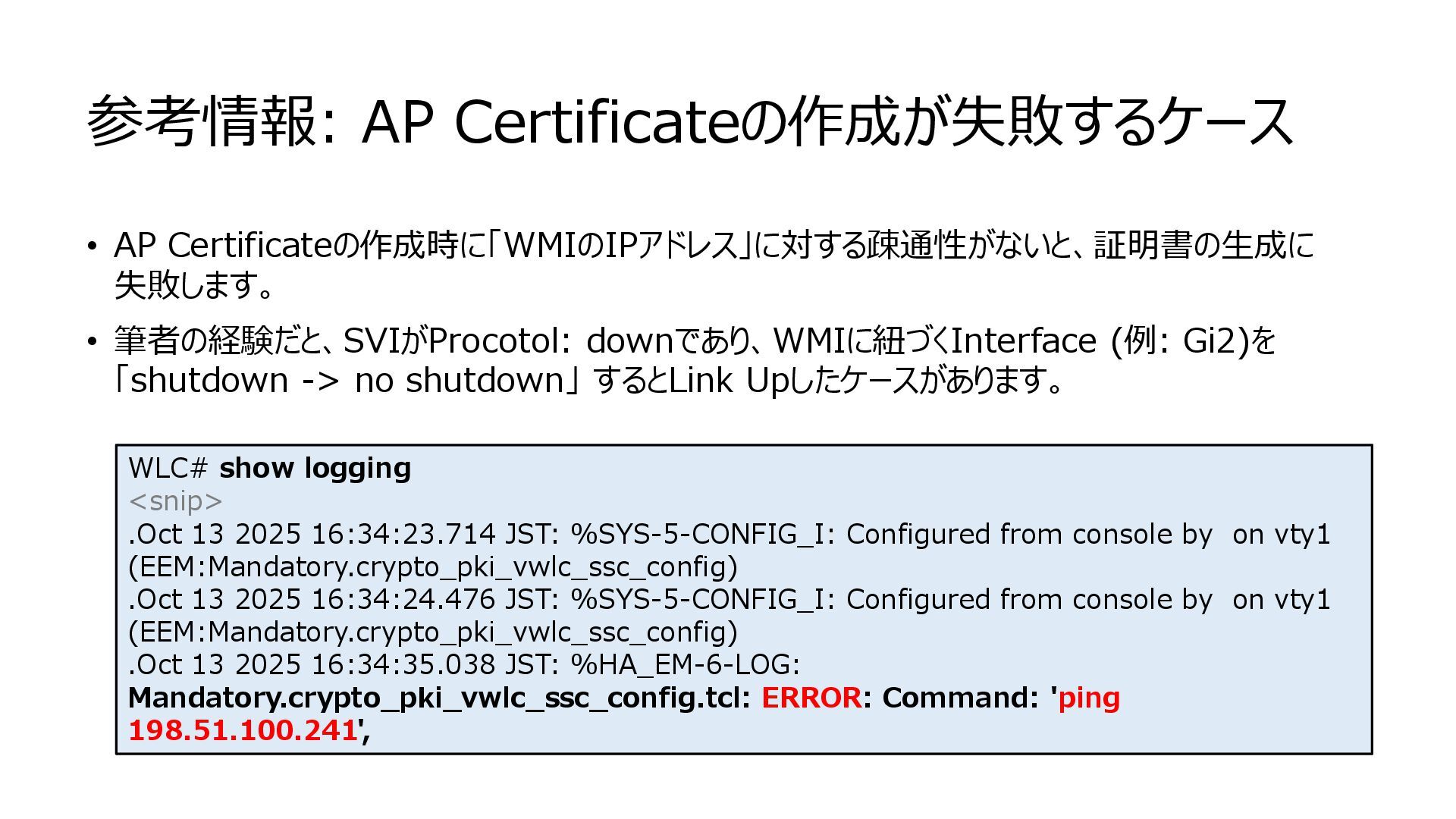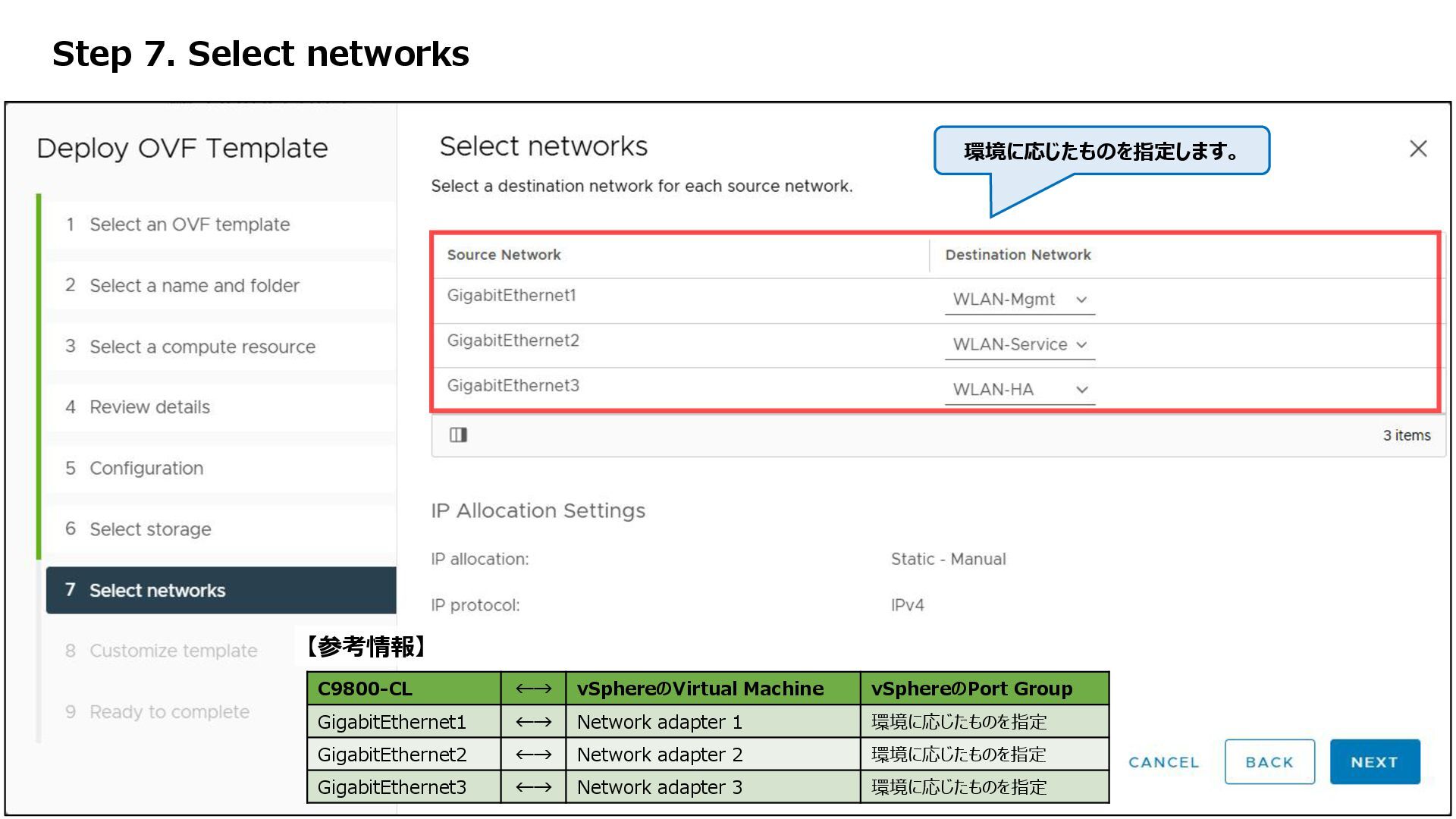 1K Clients 注記: Ultra-Low Profileで制限あり 2 vCPU, 6 GB RAM, 3 VNICs, 32 GB Disk ultra-low Ultra-Low Profileに該当します。 制約があるため、特段の理由が無い限りは 選ばないでください。 1K APs, 10K Clients 4 vCPU, 8 GB RAM, 3 VNICs, 32 GB Disk small WNCd数:1 1K APs, 10K Clients, High Throughput 7 vCPU, 8 GB RAM, 3 VNICs, 32 GB Disk small WNCd数:1 3K APs, 32K Clients 6 vCPUs, 16 GB RAM, 3 VNICs, 32 GB Disk medium WNCd数:3 3K APs, 32K Clients, High Throughput 9 vCPUs, 16 GB RAM, 3 VNICs, 32 GB Disk medium WNCd数:3 6K APs, 64K Clients 10 vCPUs, 32 GB RAM, 3 VNICs, 32 GB Disk large WNCd数:7 6K APs, 64K Clients, High Throughput 13 vCPUs, 32 GB RAM, 3 VNICs, 32 GB Disk large WNCd数:7 6K APs, 64K Clients, App Heavy 16 vCPUs, 40 GB RAM, 3 VNICs, 32 GB Disk large WNCd数:7 6K APs, 64K Clients, App Heavy High Throughput 19 vCPUs, 40 GB RAM, 3 VNICs, 32 GB Disk large WNCd数:7