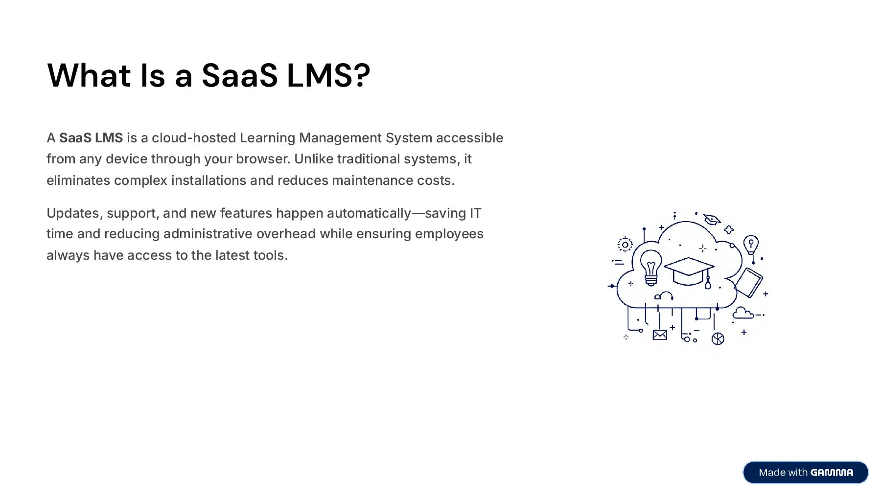 A SaaS LMS (Software as a Service Learning Management System) is a cloud-based platform that allows businesses to deliver training, onboarding, compliance programs, and professional development without the complexity of on-premise software. Unlike traditional LMS solutions, SaaS LMS platforms are accessible from any device, provide real-time updates, and scale effortlessly as organizations grow, making them ideal for modern, distributed teams.