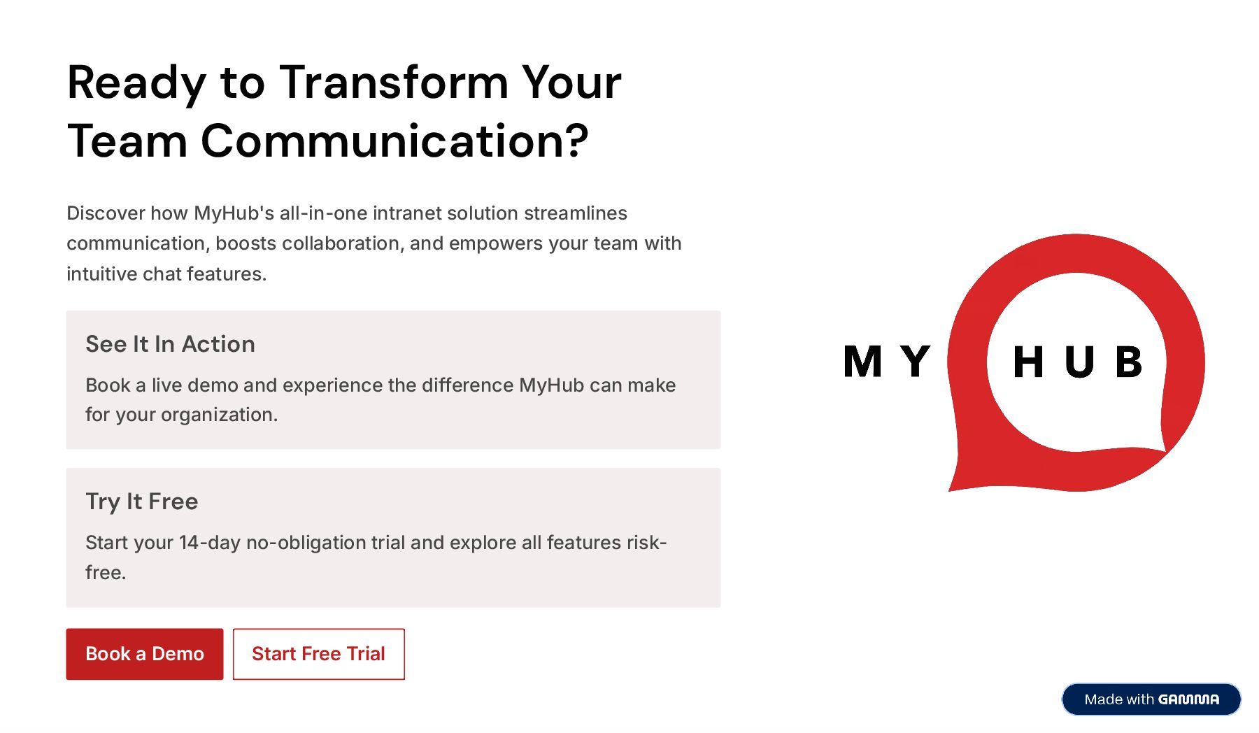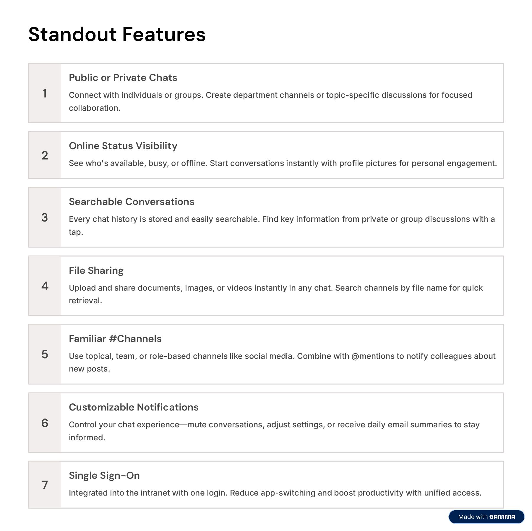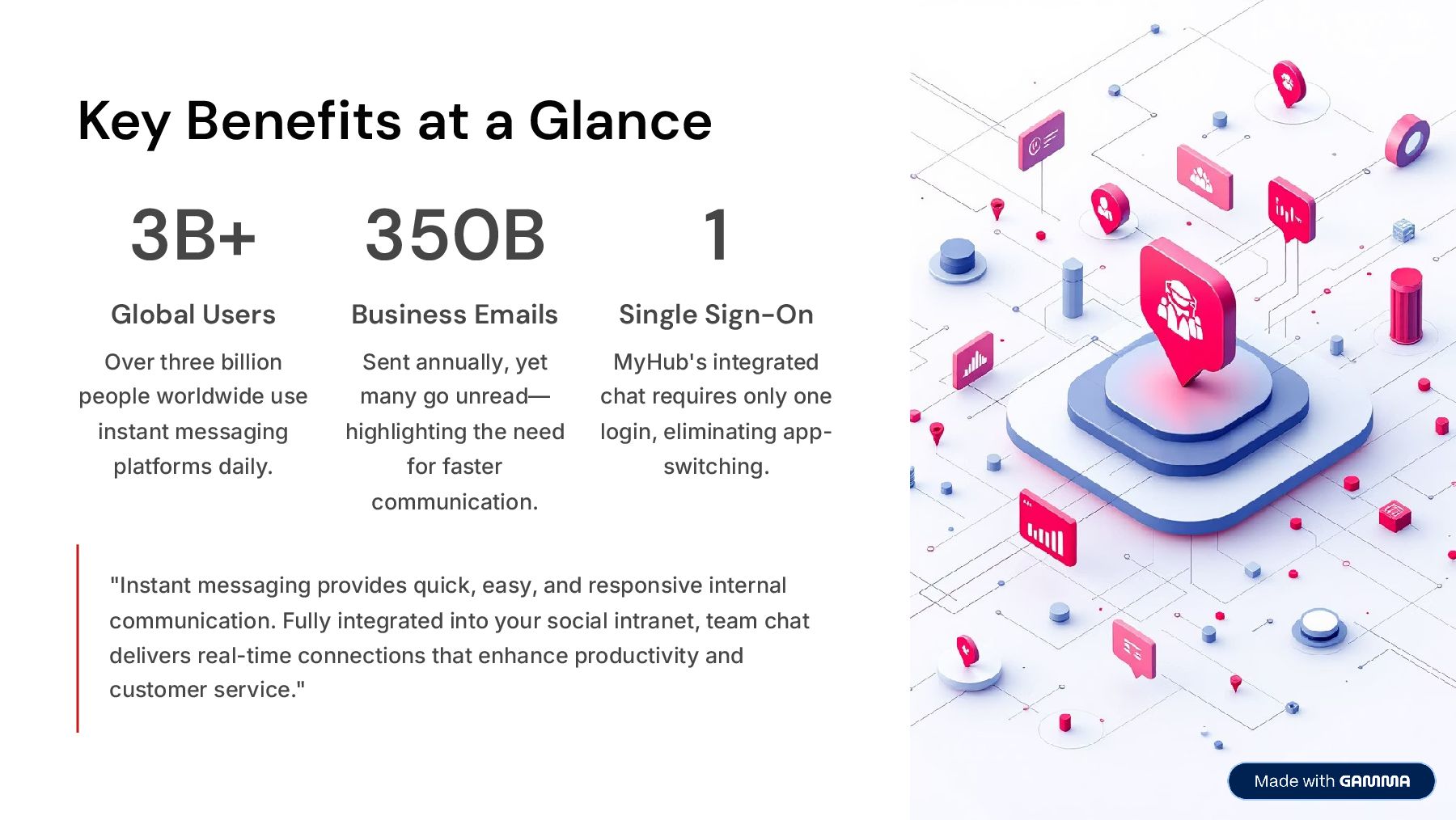 Core features of modern team chat platforms include real-time messaging with emojis and attachments, customizable notifications and themes, and powerful search capabilities that ensure past messages and files are always within reach. For organizations using intranet platforms like MyHub, integrated team chat takes collaboration up a notch—seamlessly combining messaging, channels, user status, and single sign-on access to create a fluid, productive communication experience.