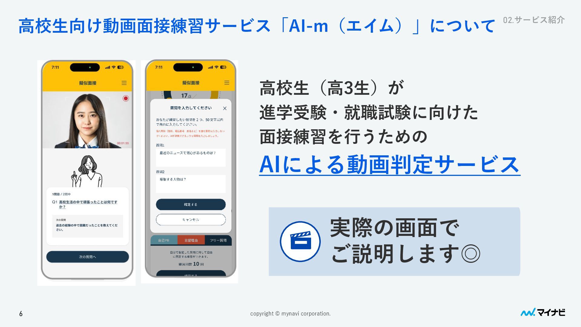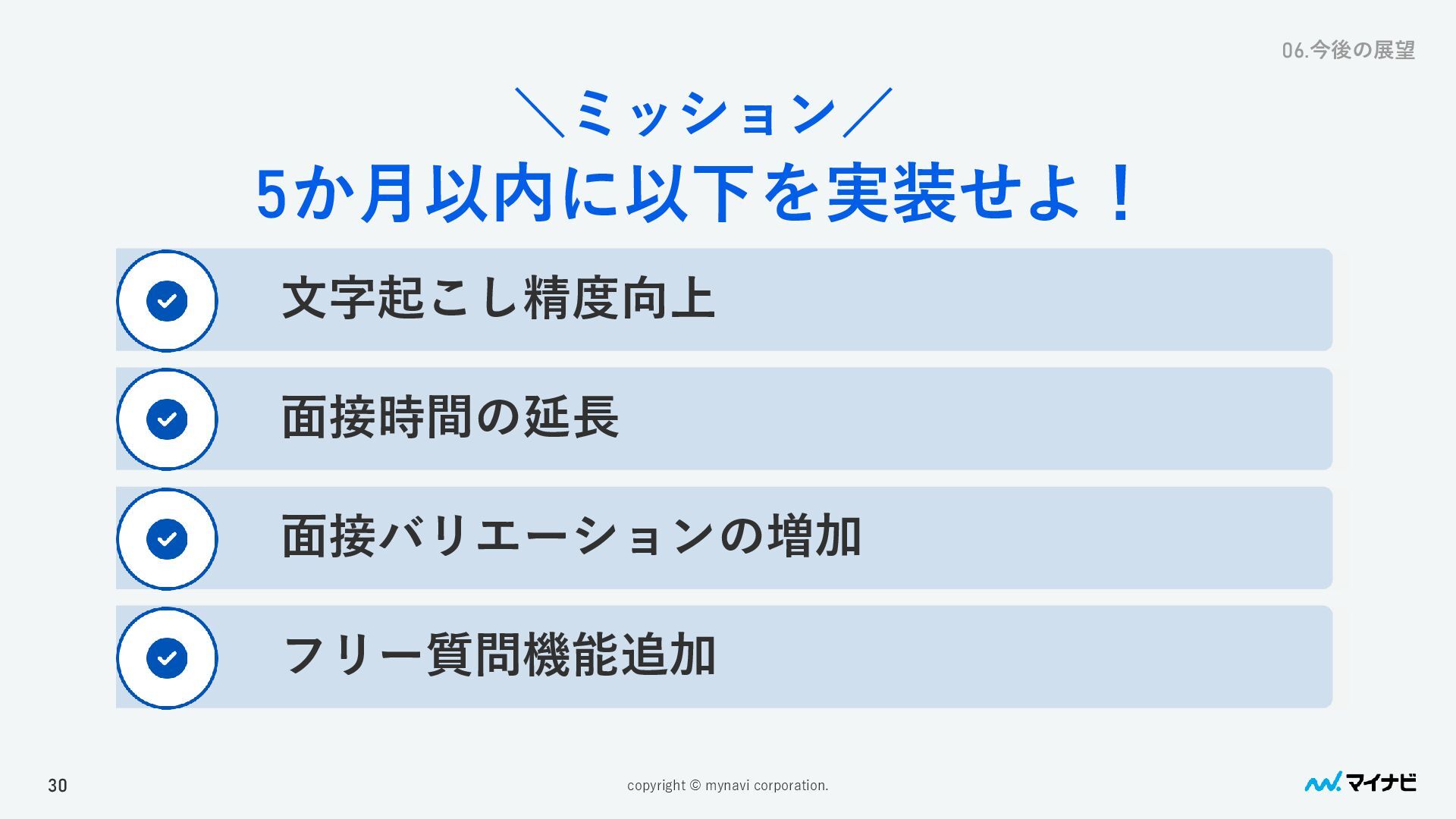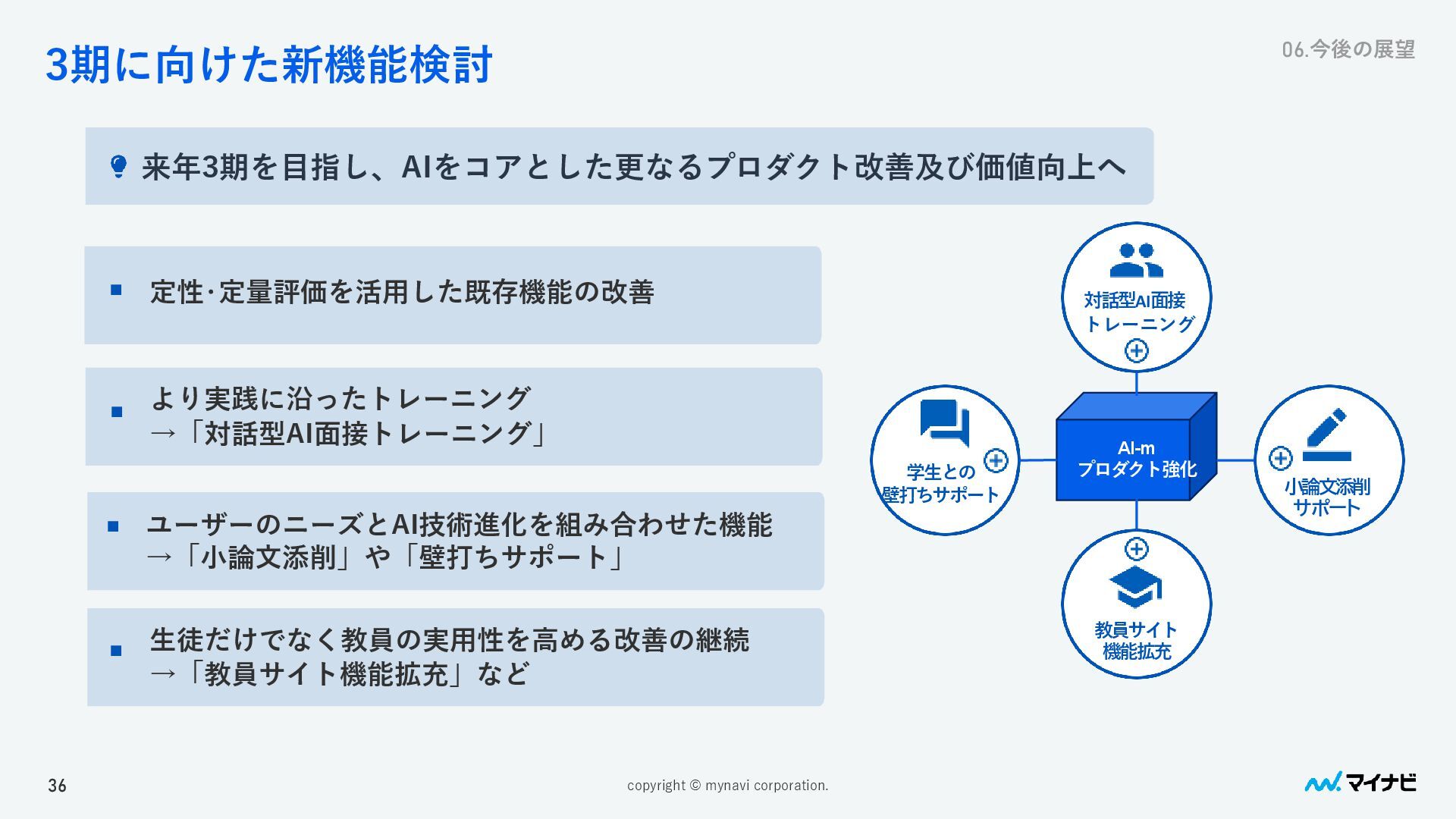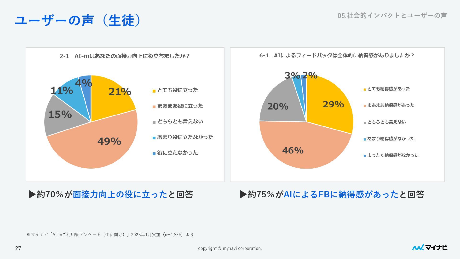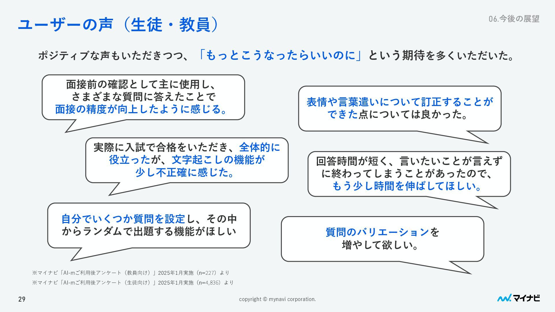 からランダムで出題する機能がほしい 質問のバリエーションを 増やして欲しい。 面接前の確認として主に使用し、 さまざまな質問に答えたことで 面接の精度が向上したように感じる。 回答時間が短く、言いたいことが言えず に終わってしまうことがあったので、 もう少し時間を伸ばしてほしい。 06.今後の展望 表情や言葉遣いについて訂正することが できた点については良かった。 ポジティブな声もいただきつつ、「もっとこうなったらいいのに」という期待を多くいただいた。 ※マイナビ「AI-mご利用後アンケート(生徒向け)」2025年1月実施(n=4,836)より ※マイナビ「AI-mご利用後アンケート(教員向け)」2025年1月実施(n=227)より