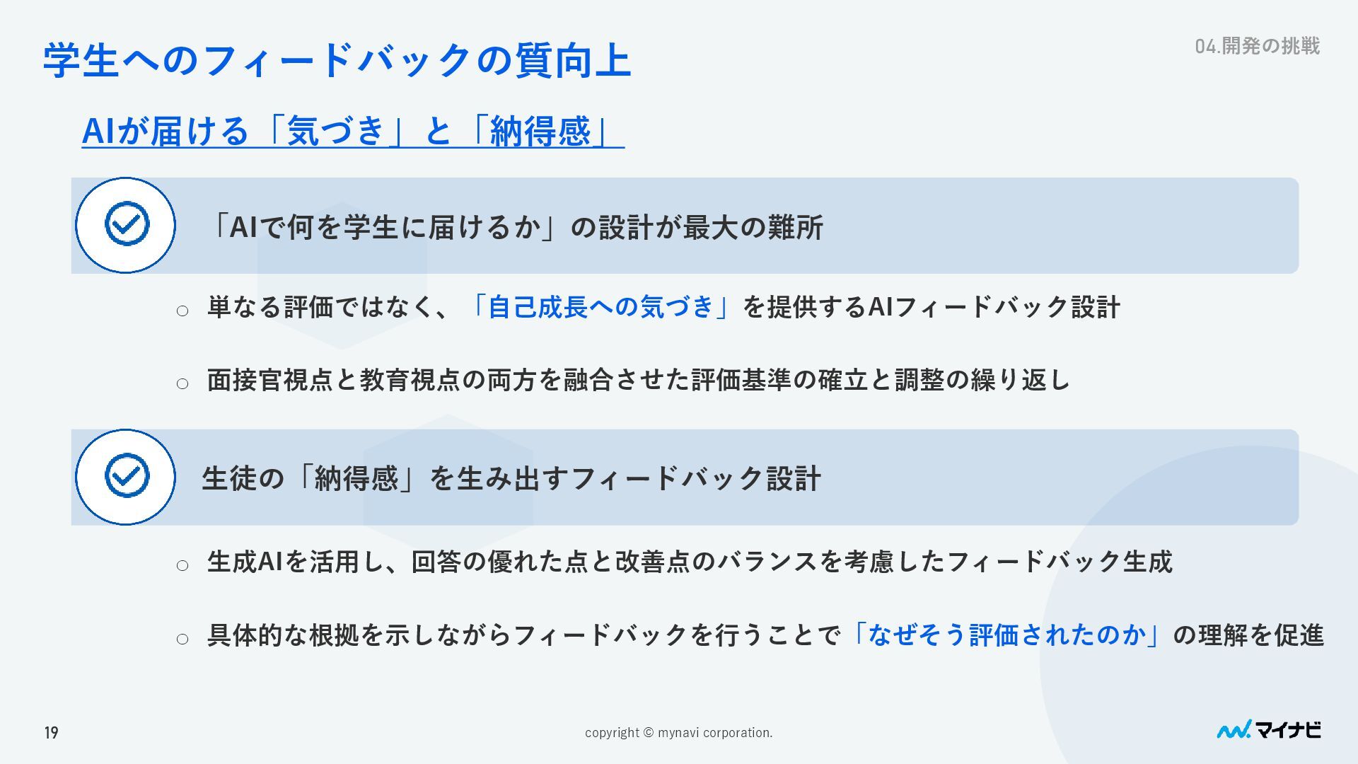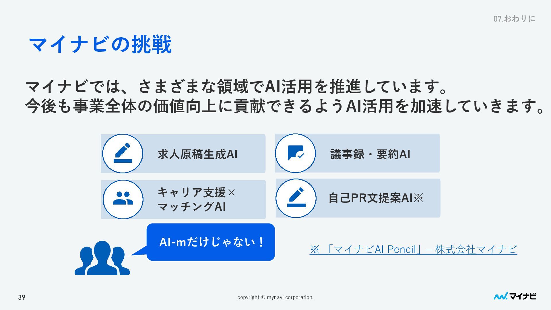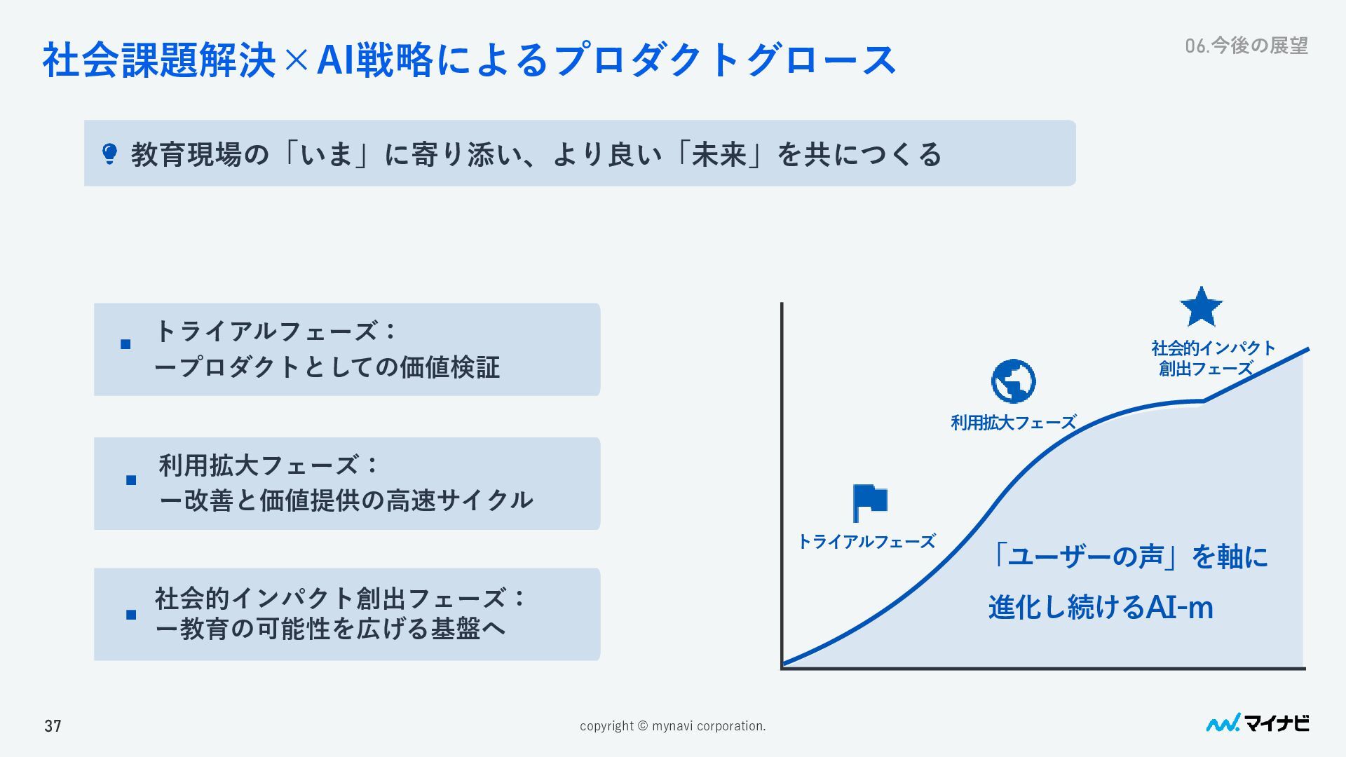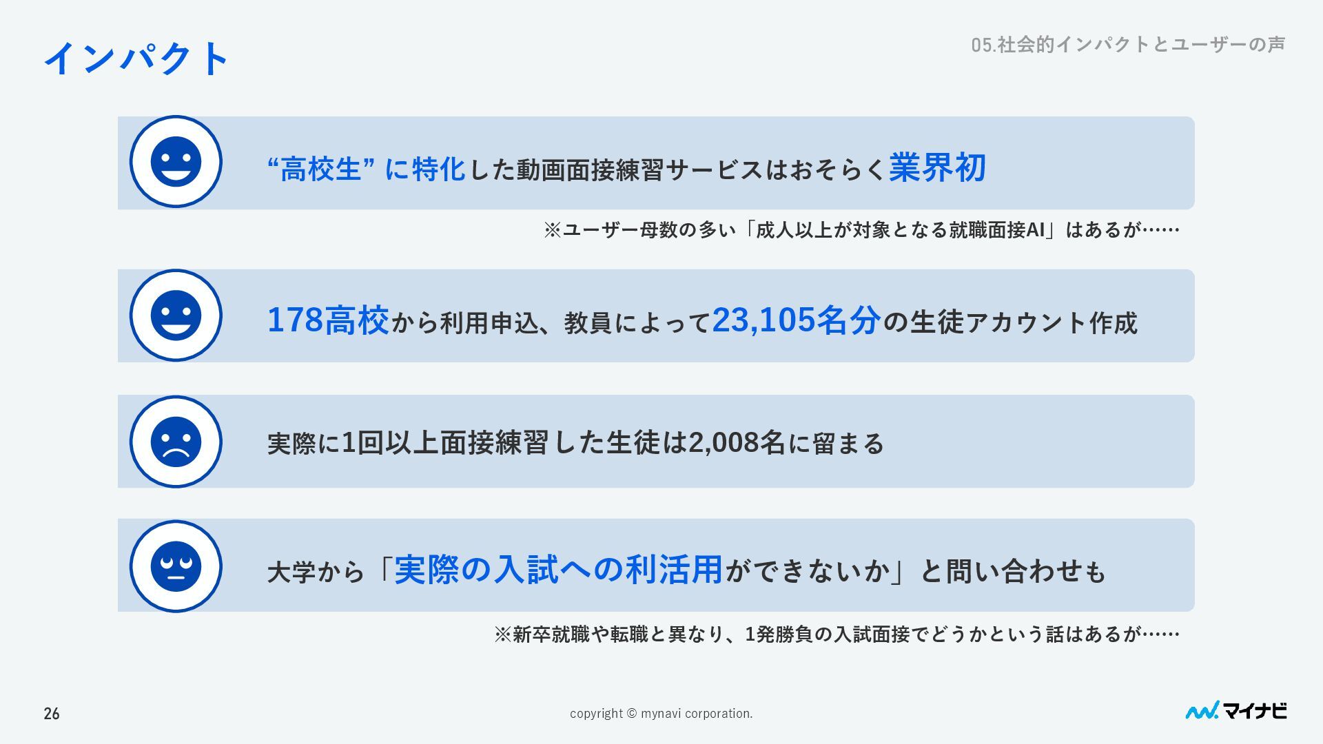 からランダムで出題する機能がほしい 質問のバリエーションを 増やして欲しい。 面接前の確認として主に使用し、 さまざまな質問に答えたことで 面接の精度が向上したように感じる。 回答時間が短く、言いたいことが言えず に終わってしまうことがあったので、 もう少し時間を伸ばしてほしい。 06.今後の展望 表情や言葉遣いについて訂正することが できた点については良かった。 ポジティブな声もいただきつつ、「もっとこうなったらいいのに」という期待を多くいただいた。 ※マイナビ「AI-mご利用後アンケート(生徒向け)」2025年1月実施(n=4,836)より ※マイナビ「AI-mご利用後アンケート(教員向け)」2025年1月実施(n=227)より