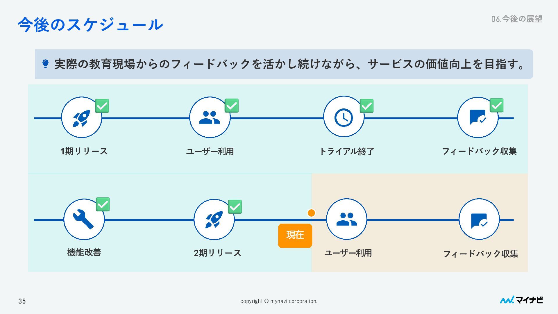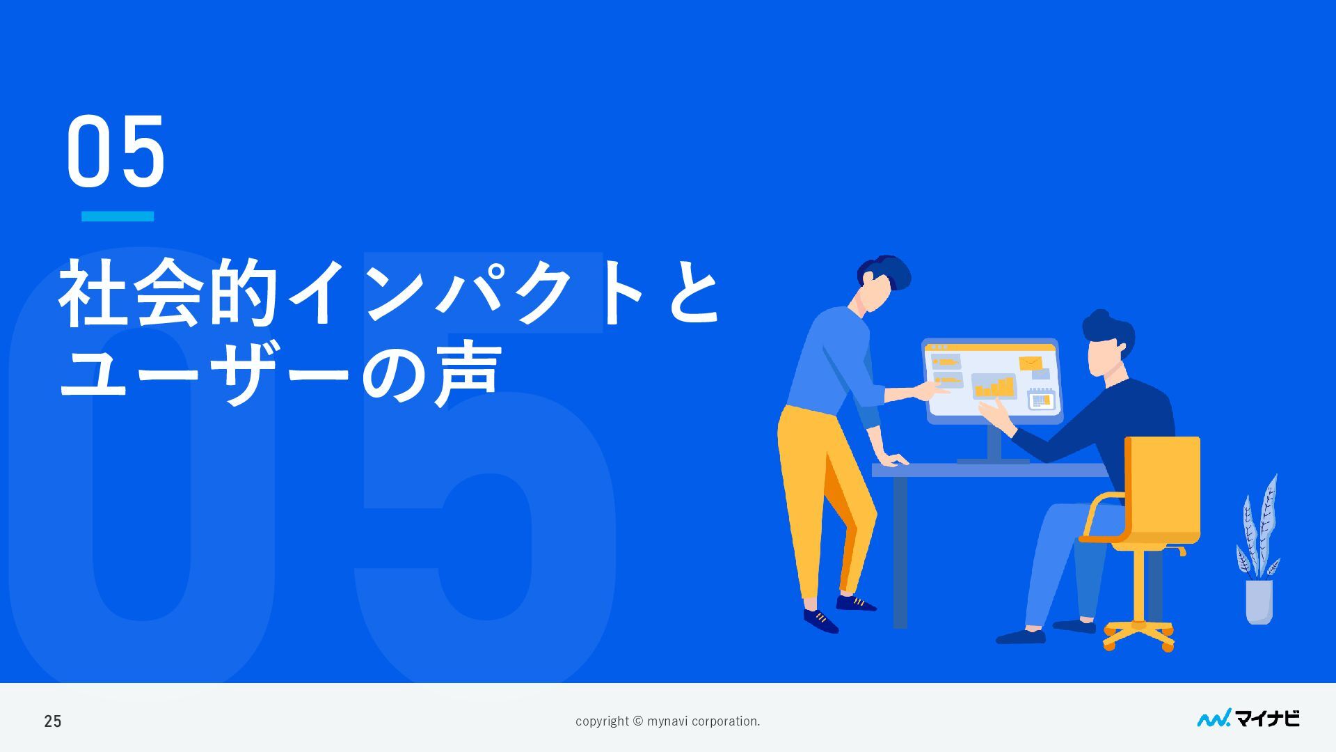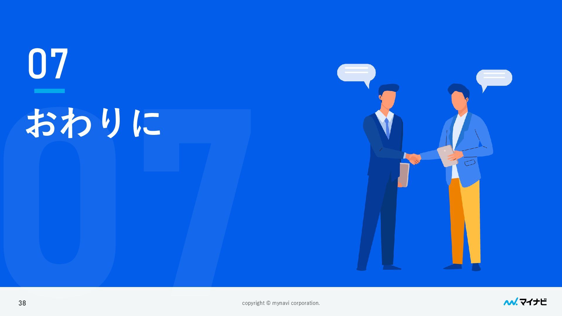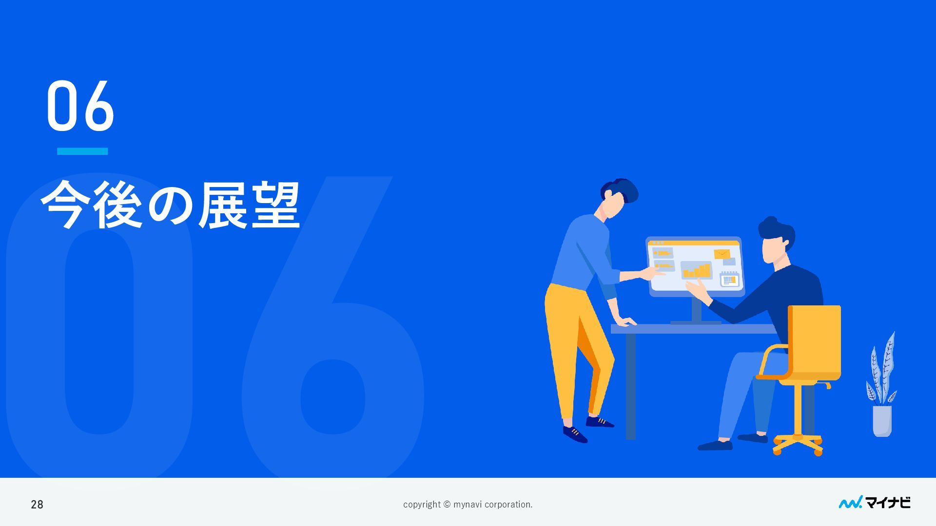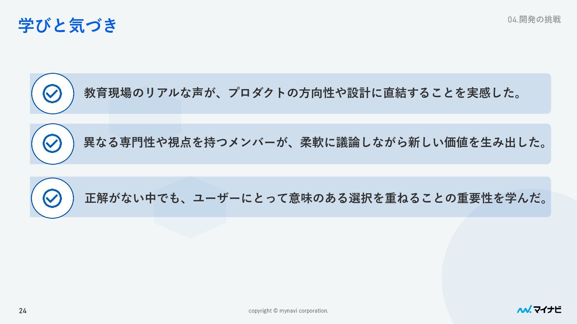 からランダムで出題する機能がほしい 質問のバリエーションを 増やして欲しい。 面接前の確認として主に使用し、 さまざまな質問に答えたことで 面接の精度が向上したように感じる。 回答時間が短く、言いたいことが言えず に終わってしまうことがあったので、 もう少し時間を伸ばしてほしい。 06.今後の展望 表情や言葉遣いについて訂正することが できた点については良かった。 ポジティブな声もいただきつつ、「もっとこうなったらいいのに」という期待を多くいただいた。 ※マイナビ「AI-mご利用後アンケート(生徒向け)」2025年1月実施(n=4,836)より ※マイナビ「AI-mご利用後アンケート(教員向け)」2025年1月実施(n=227)より