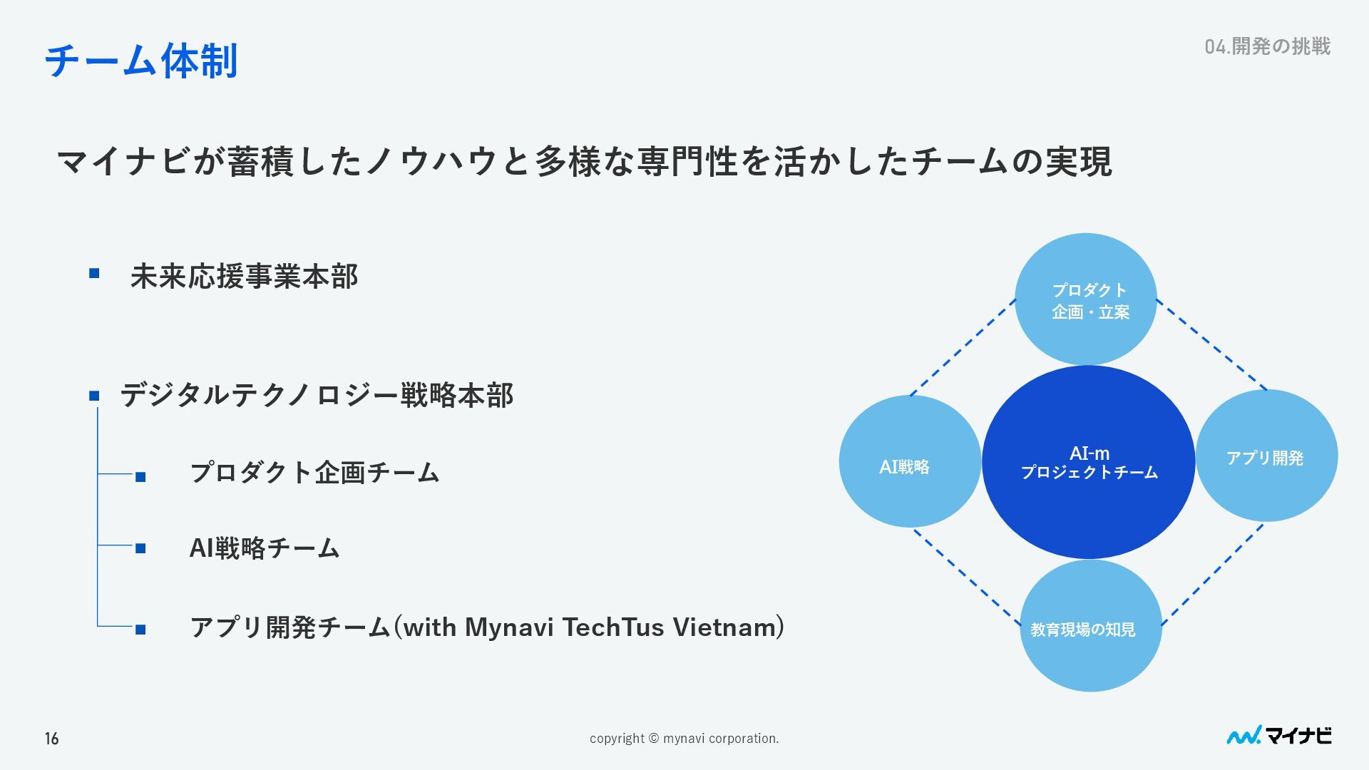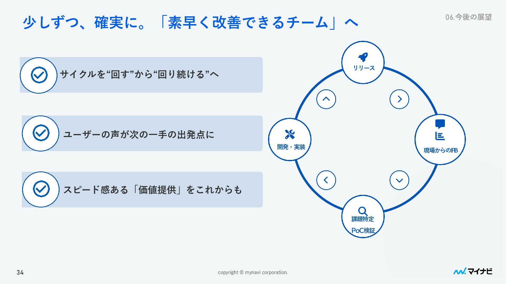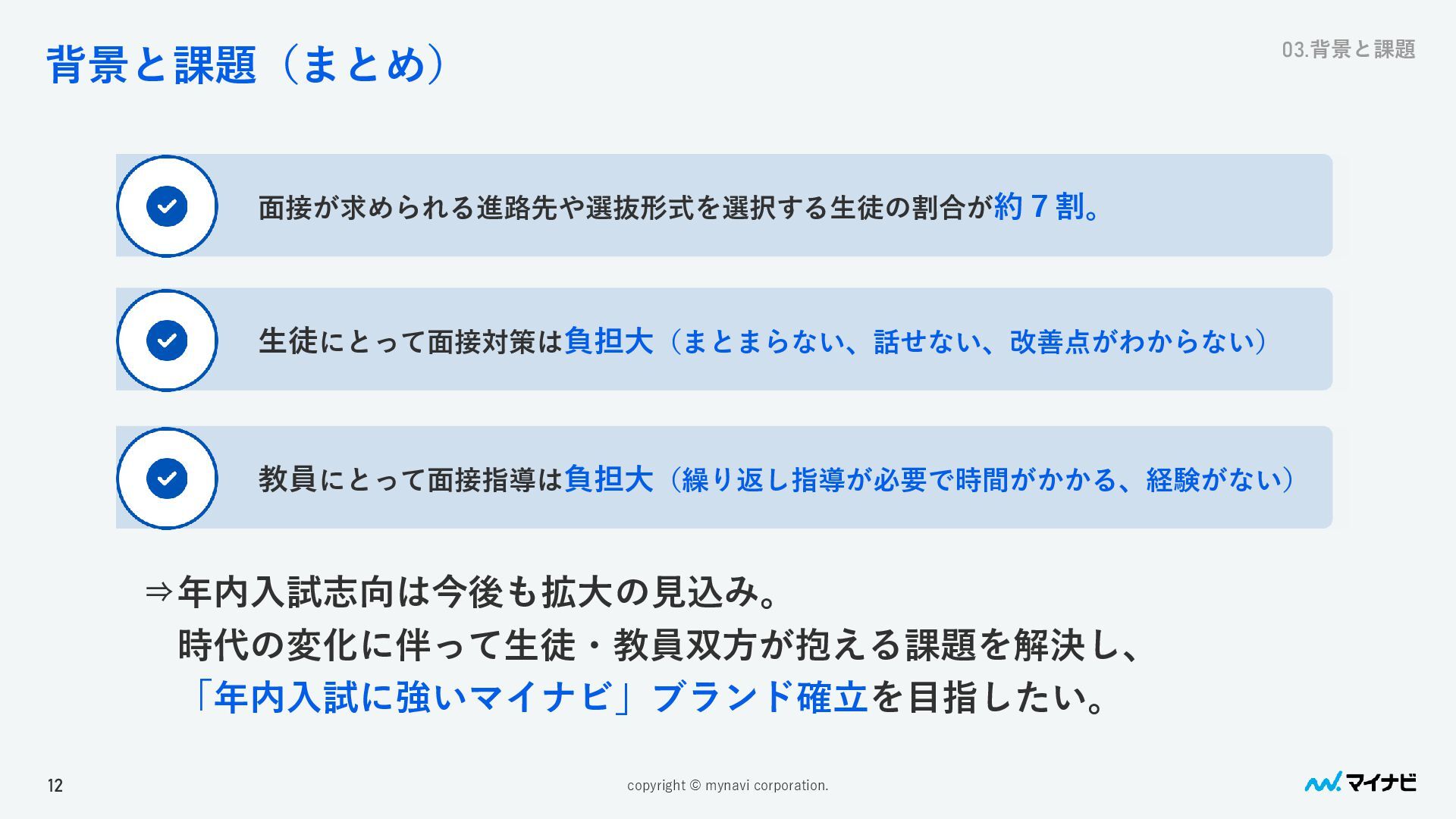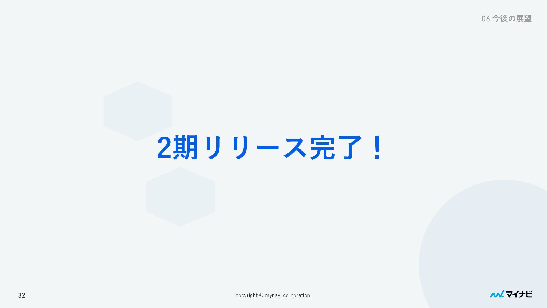 からランダムで出題する機能がほしい 質問のバリエーションを 増やして欲しい。 面接前の確認として主に使用し、 さまざまな質問に答えたことで 面接の精度が向上したように感じる。 回答時間が短く、言いたいことが言えず に終わってしまうことがあったので、 もう少し時間を伸ばしてほしい。 06.今後の展望 表情や言葉遣いについて訂正することが できた点については良かった。 ポジティブな声もいただきつつ、「もっとこうなったらいいのに」という期待を多くいただいた。 ※マイナビ「AI-mご利用後アンケート(生徒向け)」2025年1月実施(n=4,836)より ※マイナビ「AI-mご利用後アンケート(教員向け)」2025年1月実施(n=227)より