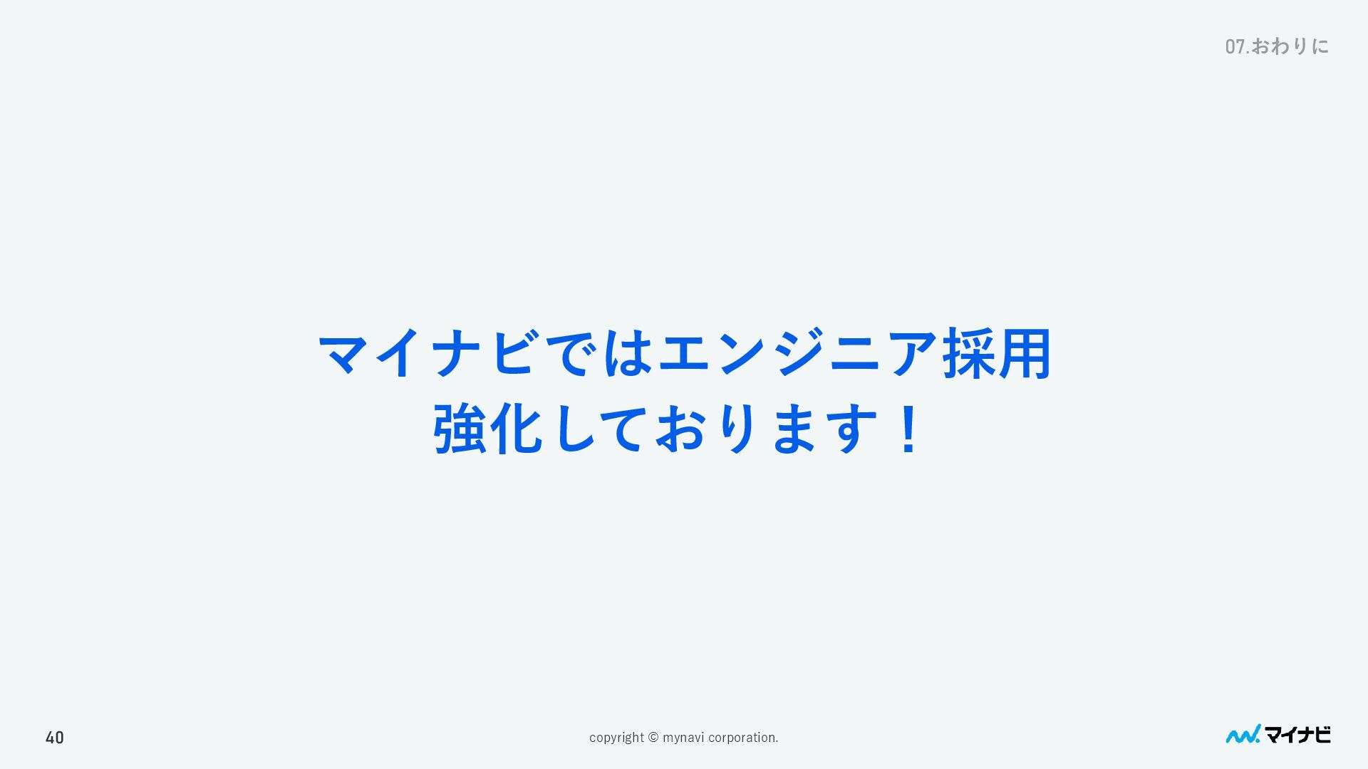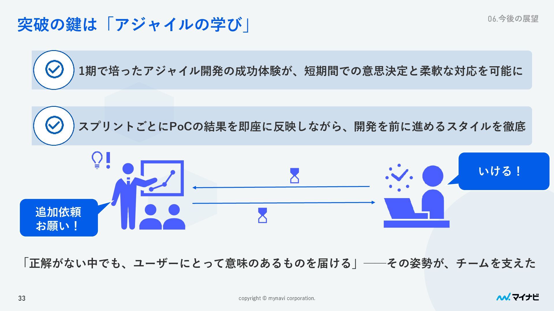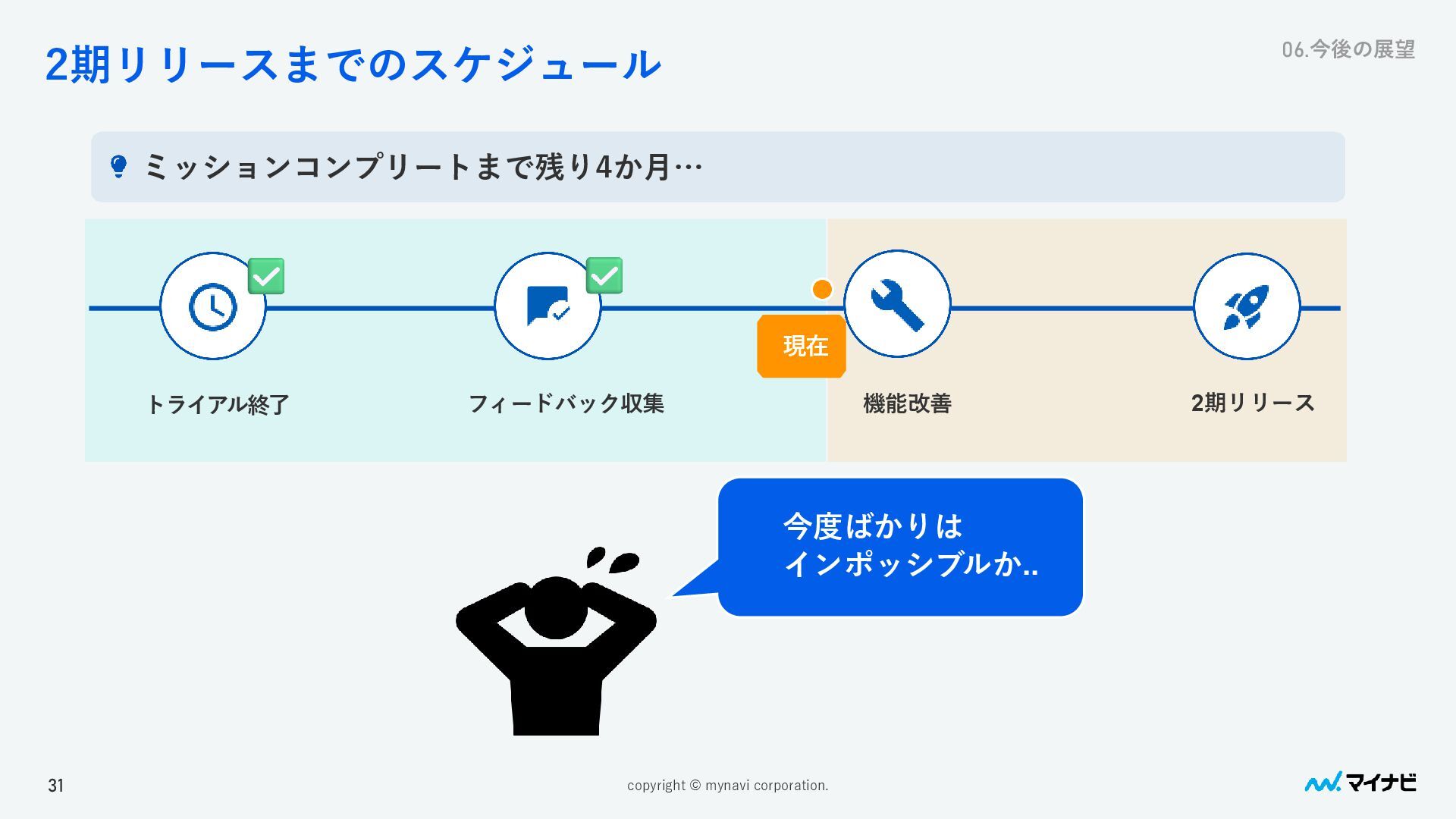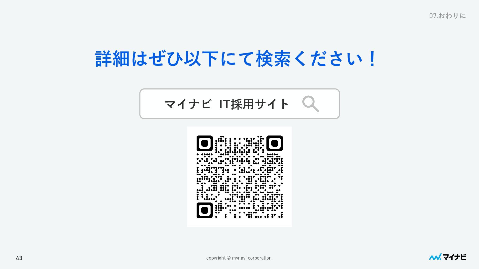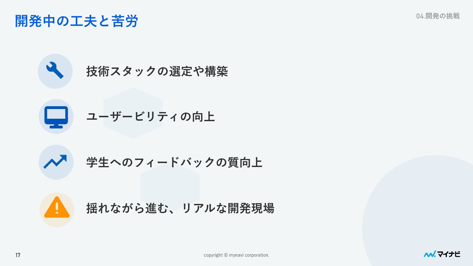 からランダムで出題する機能がほしい 質問のバリエーションを 増やして欲しい。 面接前の確認として主に使用し、 さまざまな質問に答えたことで 面接の精度が向上したように感じる。 回答時間が短く、言いたいことが言えず に終わってしまうことがあったので、 もう少し時間を伸ばしてほしい。 06.今後の展望 表情や言葉遣いについて訂正することが できた点については良かった。 ポジティブな声もいただきつつ、「もっとこうなったらいいのに」という期待を多くいただいた。 ※マイナビ「AI-mご利用後アンケート(生徒向け)」2025年1月実施(n=4,836)より ※マイナビ「AI-mご利用後アンケート(教員向け)」2025年1月実施(n=227)より
