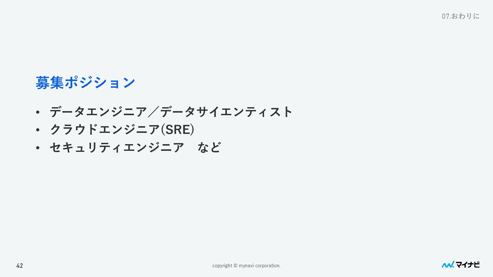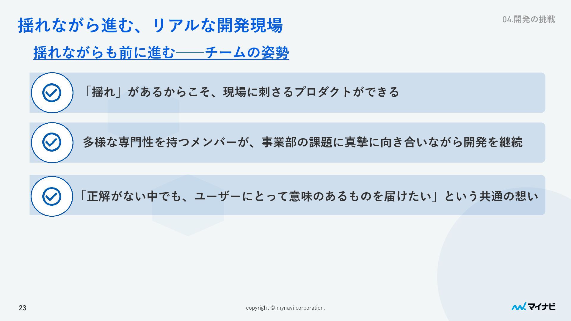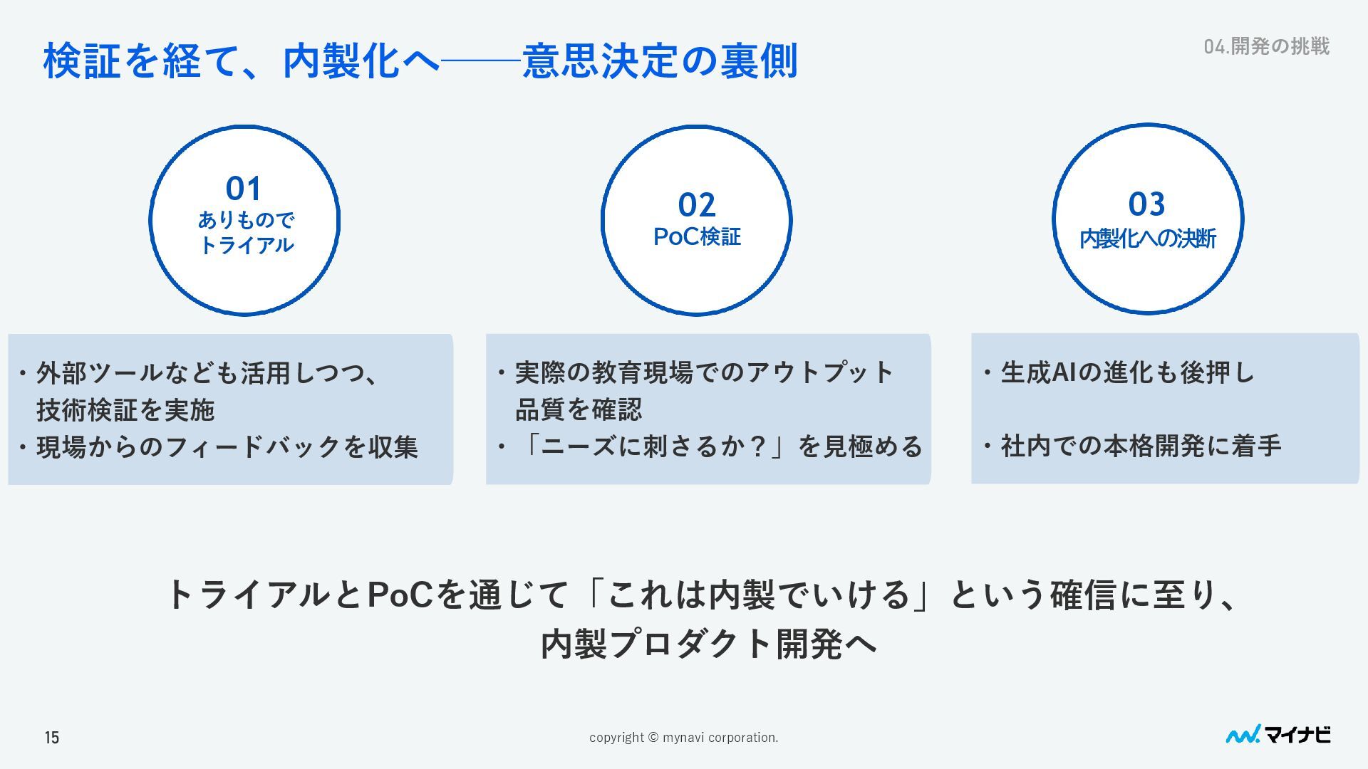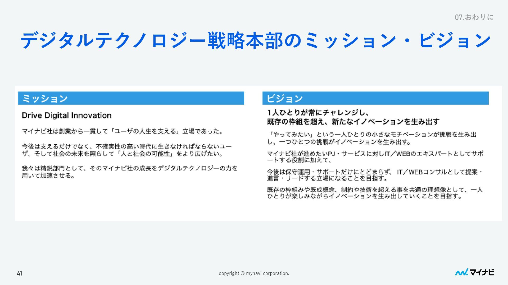 からランダムで出題する機能がほしい 質問のバリエーションを 増やして欲しい。 面接前の確認として主に使用し、 さまざまな質問に答えたことで 面接の精度が向上したように感じる。 回答時間が短く、言いたいことが言えず に終わってしまうことがあったので、 もう少し時間を伸ばしてほしい。 06.今後の展望 表情や言葉遣いについて訂正することが できた点については良かった。 ポジティブな声もいただきつつ、「もっとこうなったらいいのに」という期待を多くいただいた。 ※マイナビ「AI-mご利用後アンケート(生徒向け)」2025年1月実施(n=4,836)より ※マイナビ「AI-mご利用後アンケート(教員向け)」2025年1月実施(n=227)より