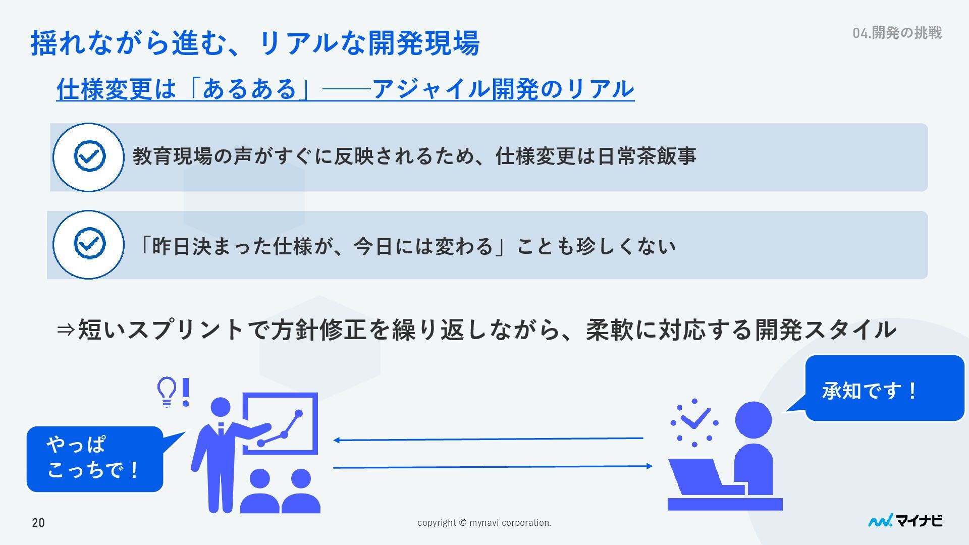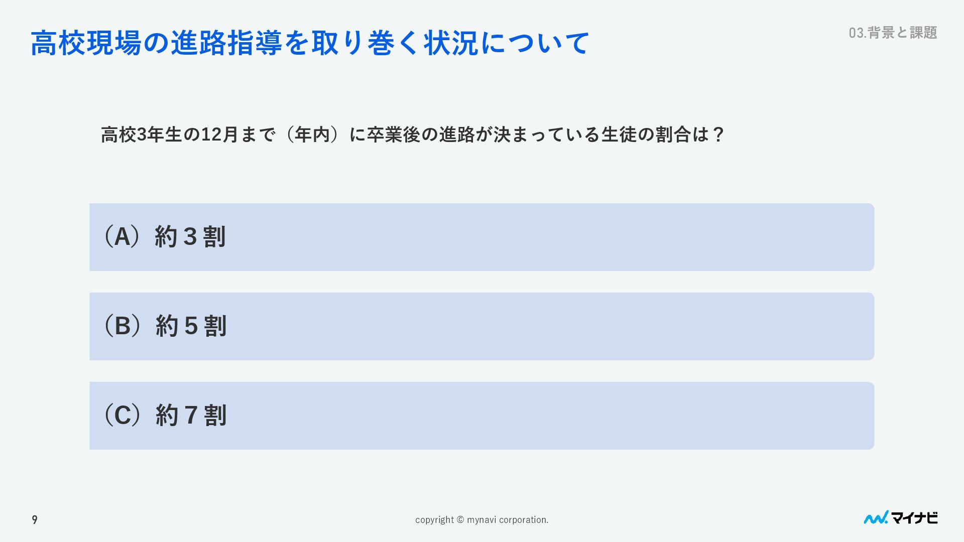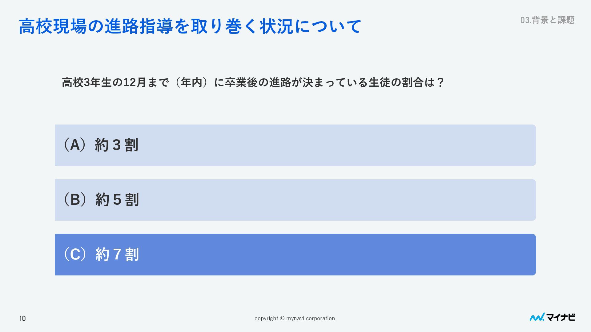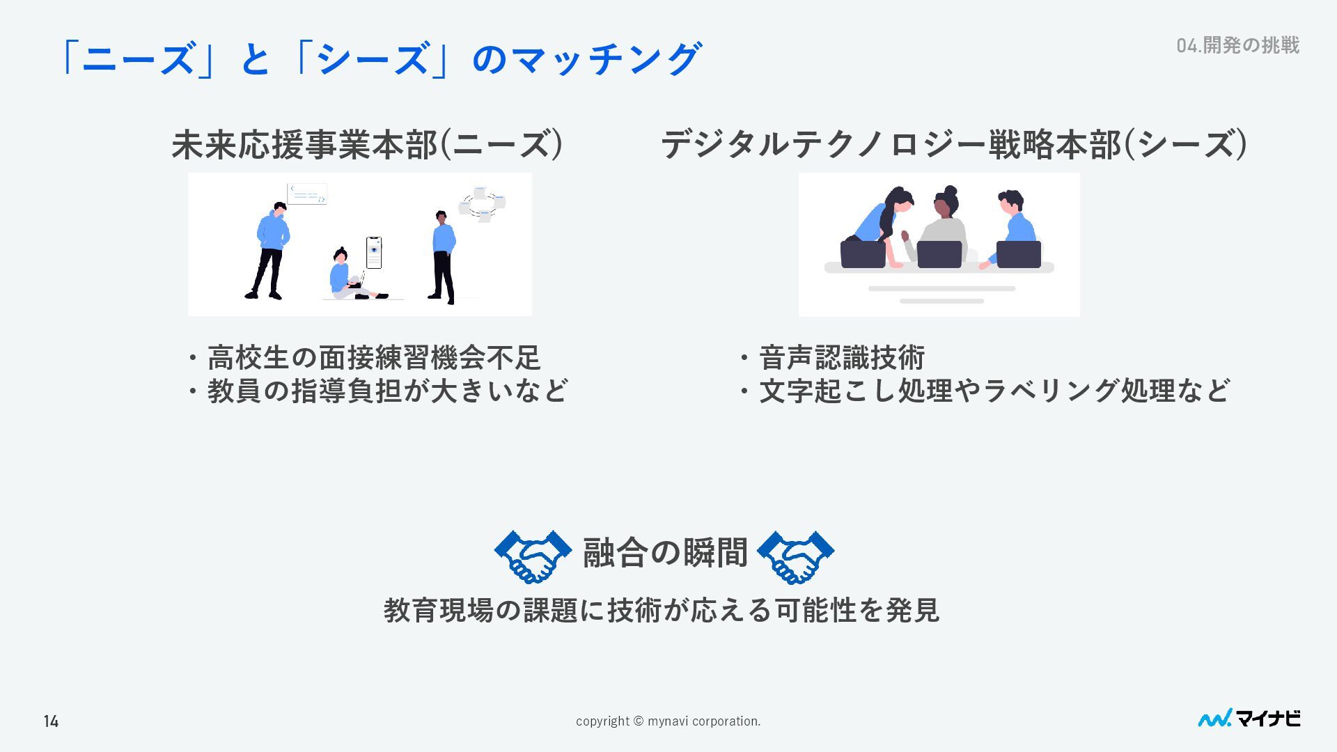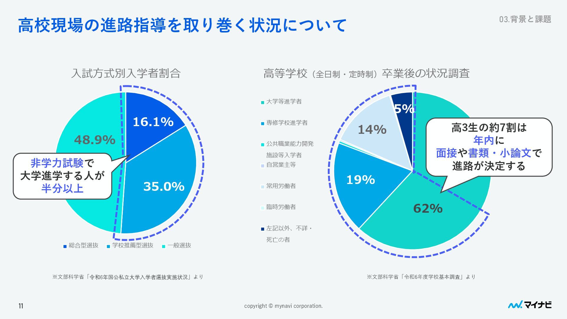からランダムで出題する機能がほしい 質問のバリエーションを 増やして欲しい。 面接前の確認として主に使用し、 さまざまな質問に答えたことで 面接の精度が向上したように感じる。 回答時間が短く、言いたいことが言えず に終わってしまうことがあったので、 もう少し時間を伸ばしてほしい。 06.今後の展望 表情や言葉遣いについて訂正することが できた点については良かった。 ポジティブな声もいただきつつ、「もっとこうなったらいいのに」という期待を多くいただいた。 ※マイナビ「AI-mご利用後アンケート(生徒向け)」2025年1月実施(n=4,836)より ※マイナビ「AI-mご利用後アンケート(教員向け)」2025年1月実施(n=227)より