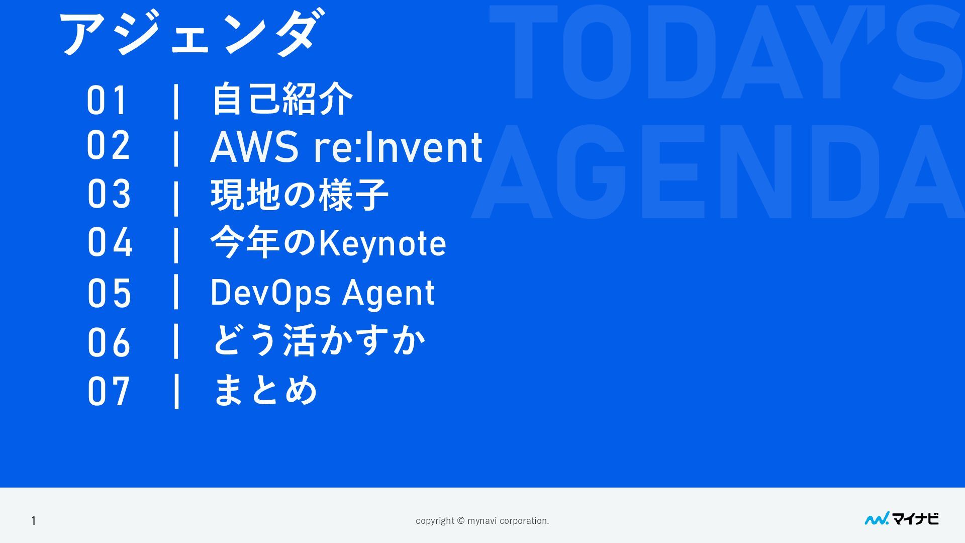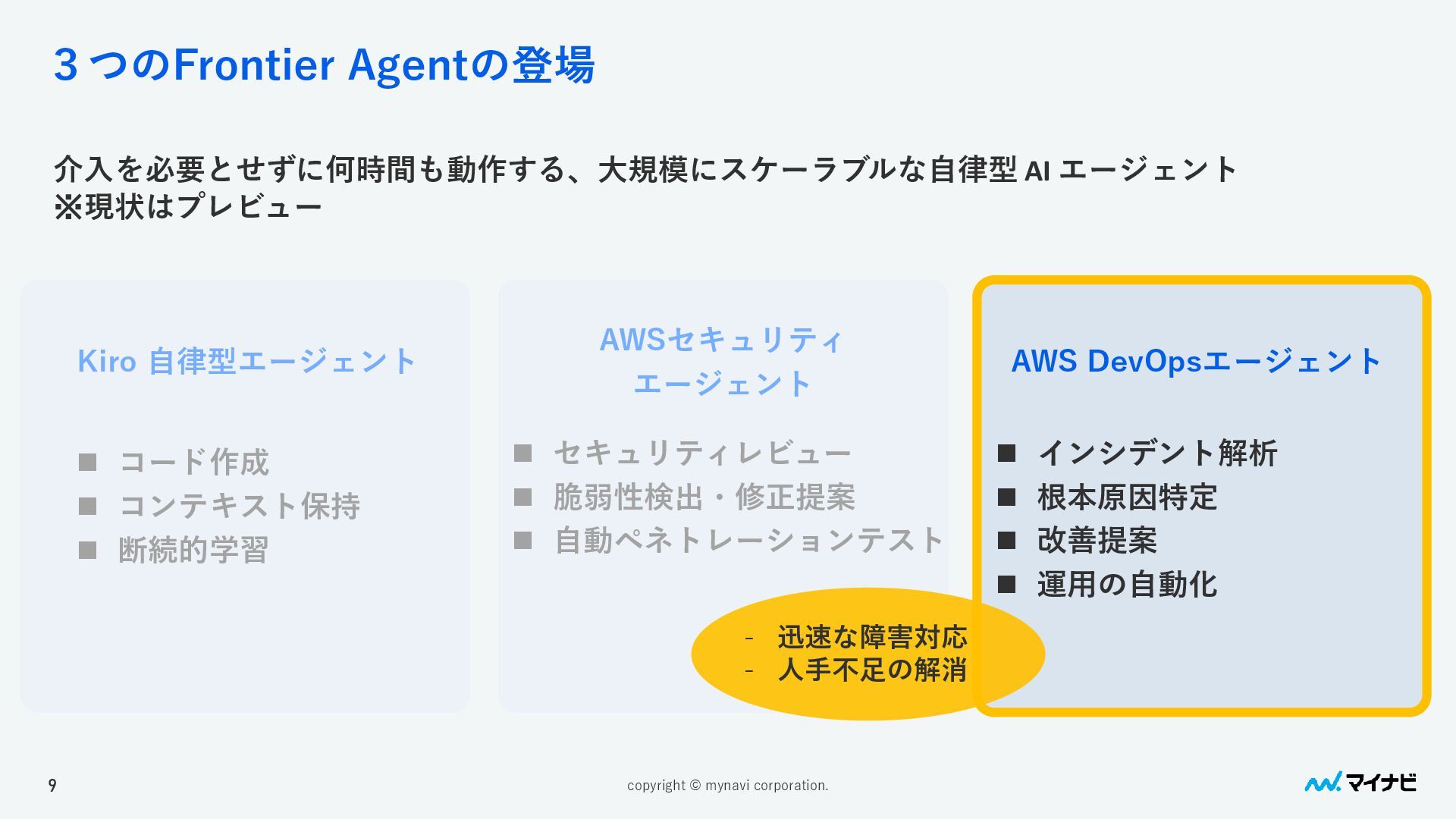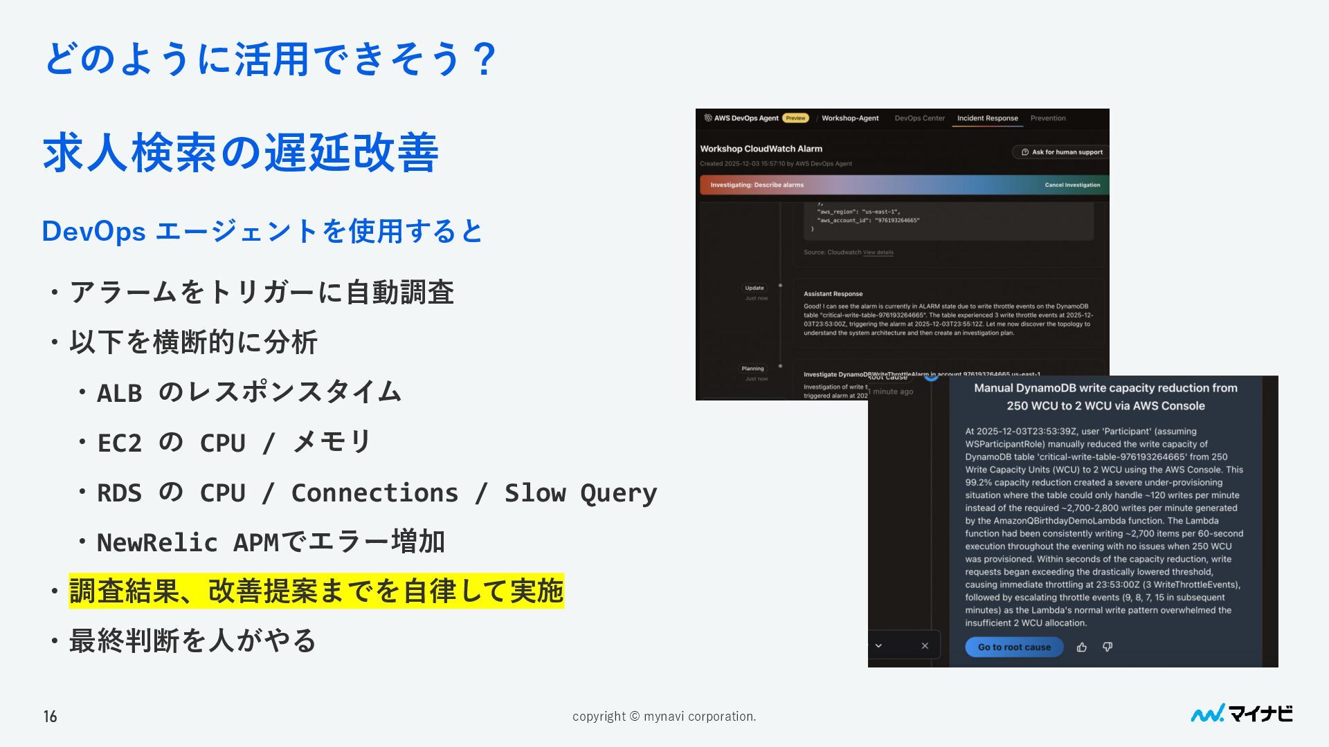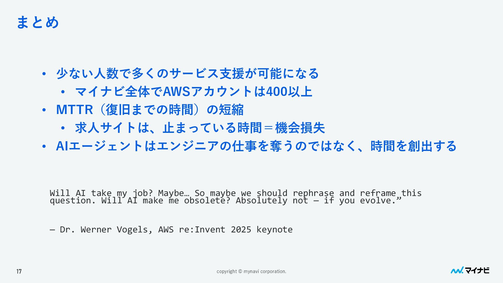 job? Maybe… So maybe we should rephrase and reframe this question. Will AI make me obsolete? Absolutely not — if you evolve.” — Dr. Werner Vogels, AWS re:Invent 2025 keynote • 少ない人数で多くのサービス支援が可能になる • マイナビ全体でAWSアカウントは400以上 • MTTR(復旧までの時間)の短縮 • 求人サイトは、止まっている時間=機会損失 • AIエージェントはエンジニアの仕事を奪うのではなく、時間を創出する