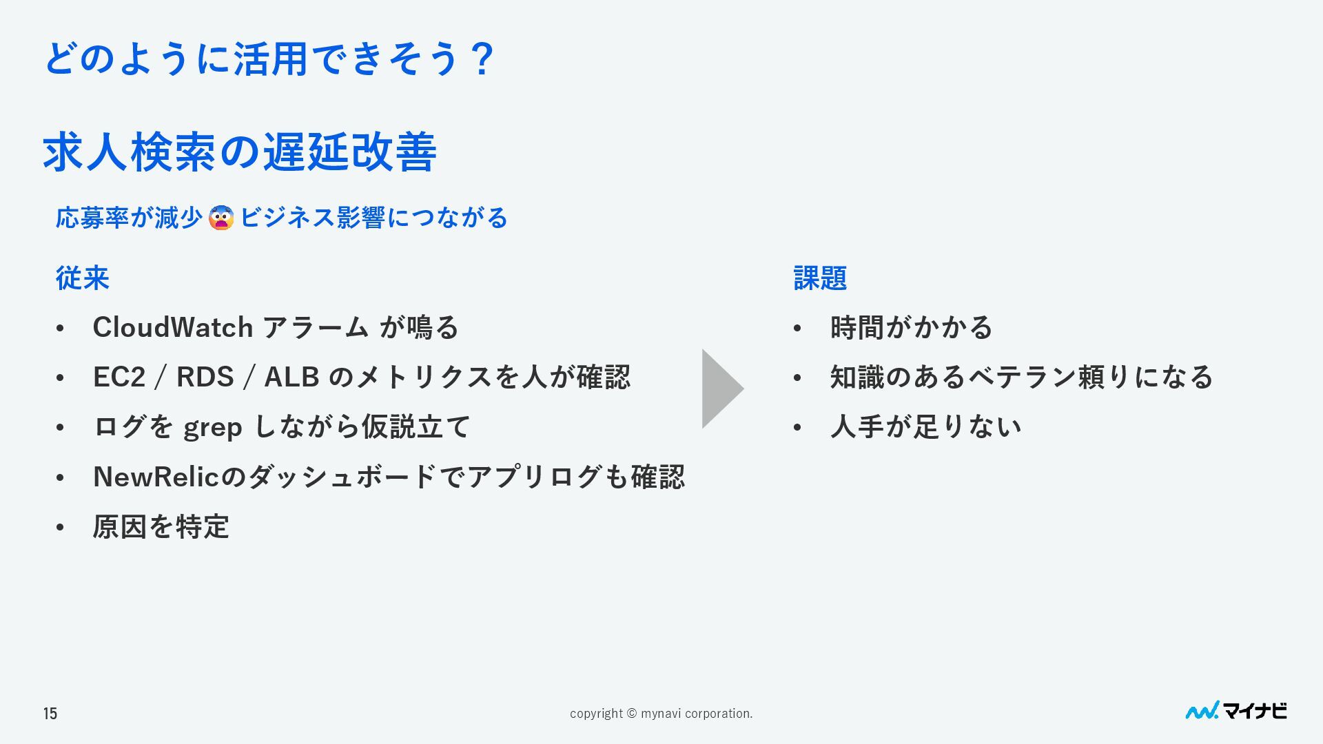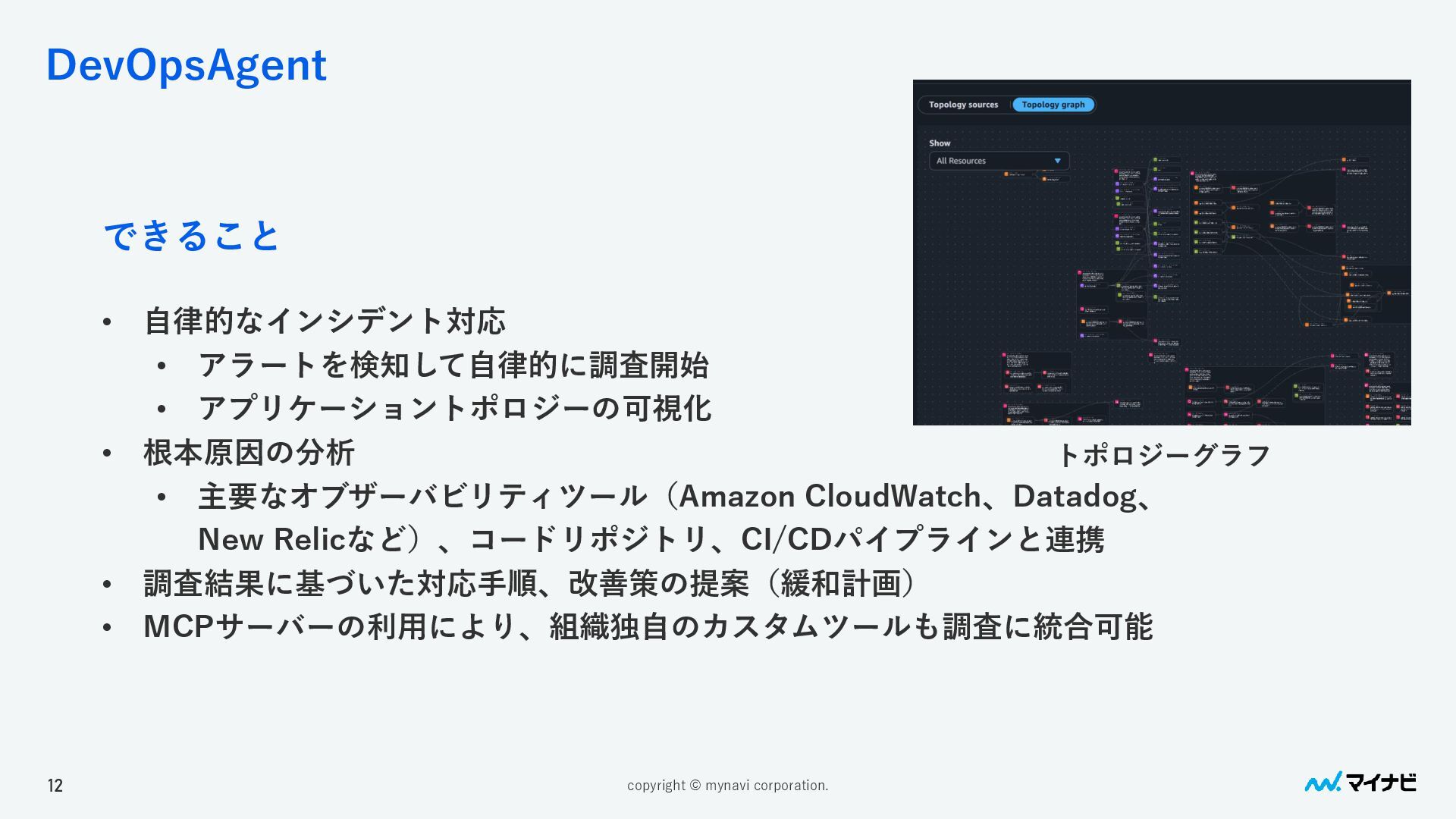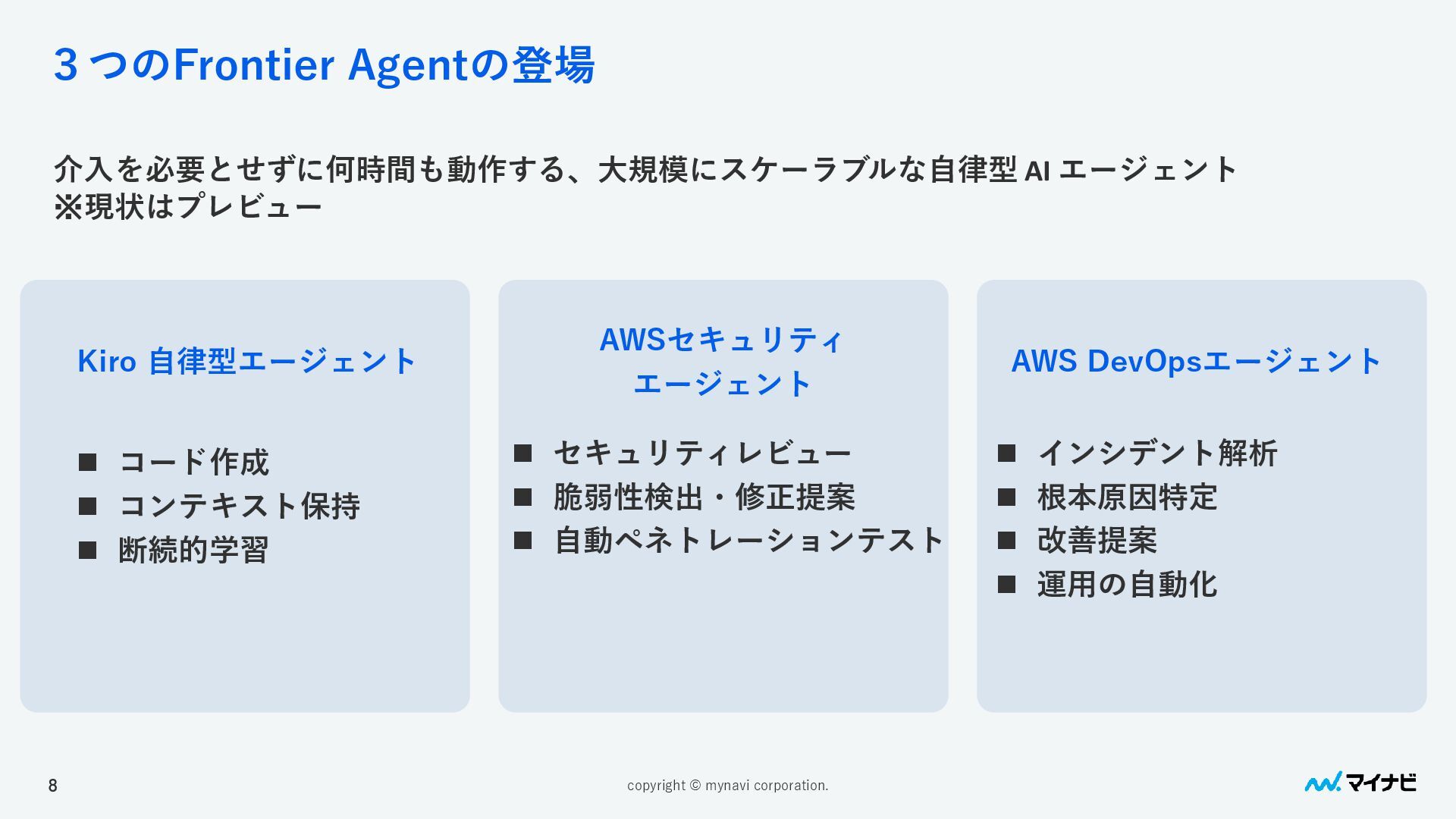 job? Maybe… So maybe we should rephrase and reframe this question. Will AI make me obsolete? Absolutely not — if you evolve.” — Dr. Werner Vogels, AWS re:Invent 2025 keynote • 少ない人数で多くのサービス支援が可能になる • マイナビ全体でAWSアカウントは400以上 • MTTR(復旧までの時間)の短縮 • 求人サイトは、止まっている時間=機会損失 • AIエージェントはエンジニアの仕事を奪うのではなく、時間を創出する