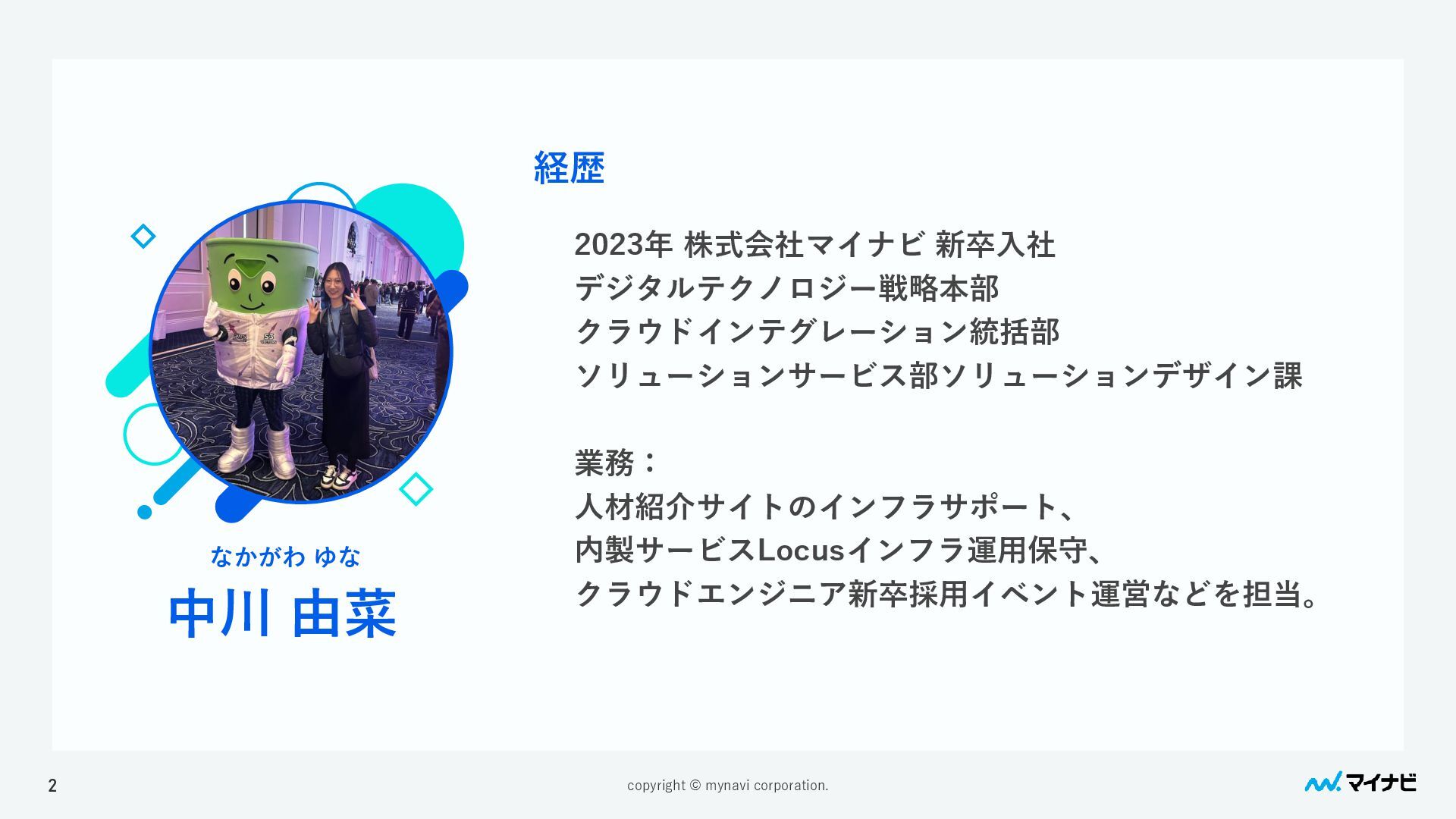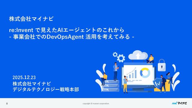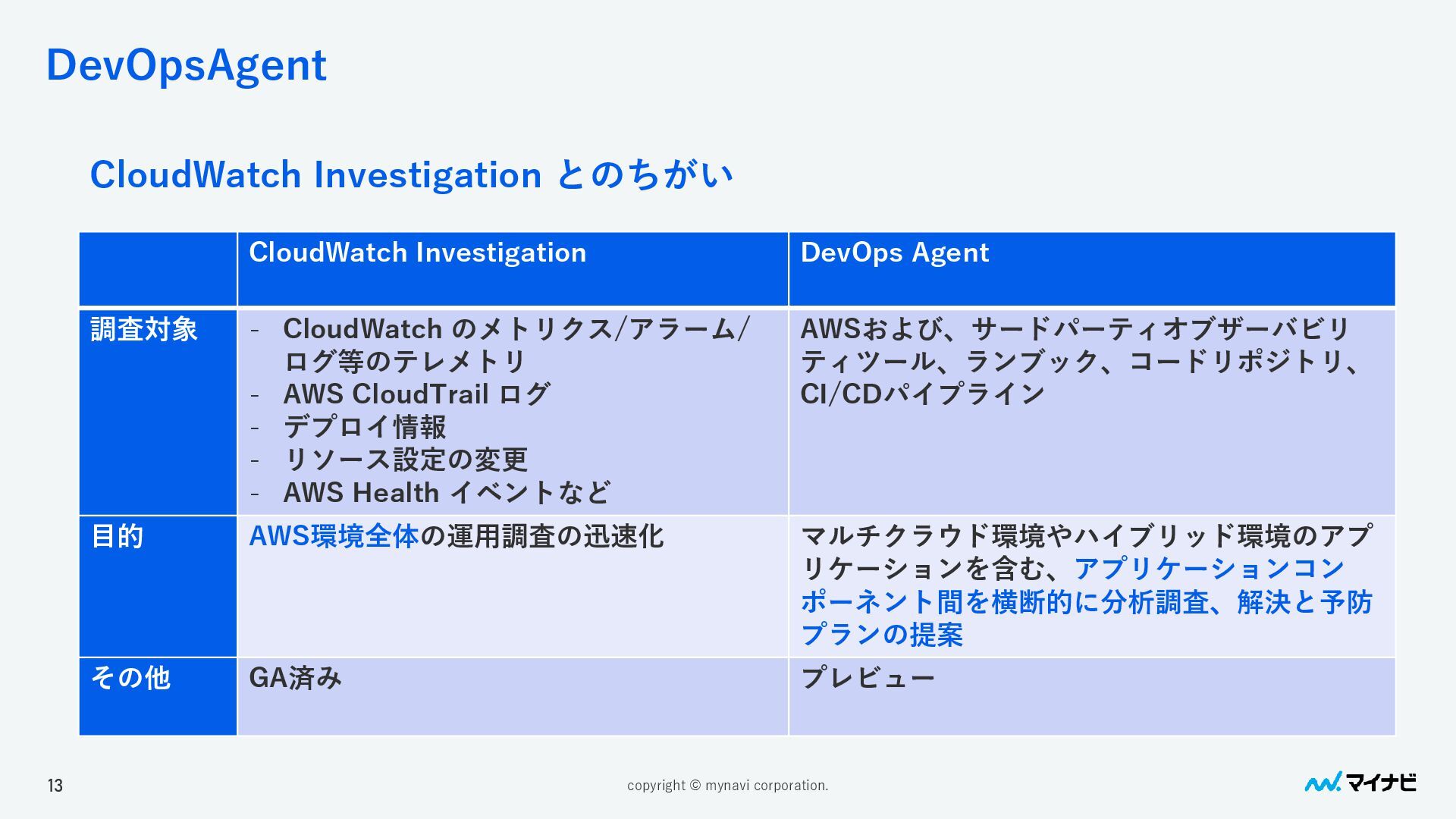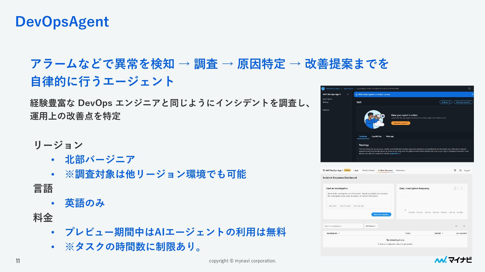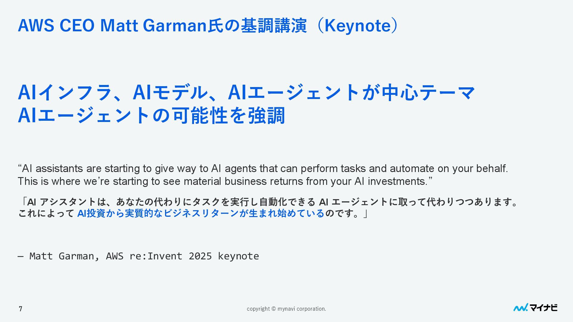 job? Maybe… So maybe we should rephrase and reframe this question. Will AI make me obsolete? Absolutely not — if you evolve.” — Dr. Werner Vogels, AWS re:Invent 2025 keynote • 少ない人数で多くのサービス支援が可能になる • マイナビ全体でAWSアカウントは400以上 • MTTR(復旧までの時間)の短縮 • 求人サイトは、止まっている時間=機会損失 • AIエージェントはエンジニアの仕事を奪うのではなく、時間を創出する