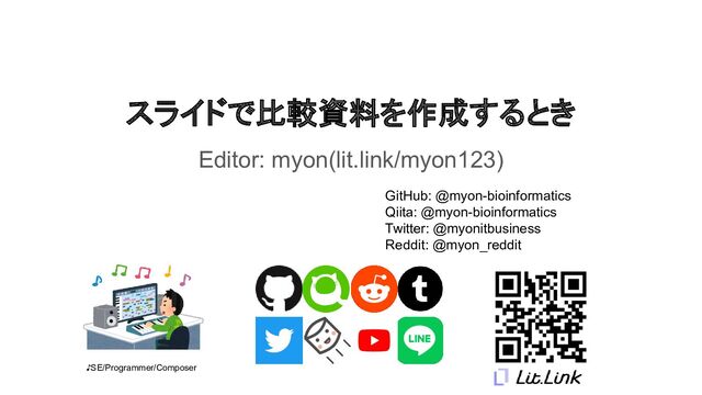 スライドで比較資料を作成するとき Editor: myon(lit.link/myon123) GitHub: @myon-bioinformatics Qiita: @myon-bioinformatics Twitter: @myonitbusiness Reddit: