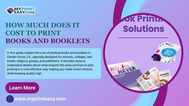 In this guide, explain the cost of printing books and booklets in Garden Grove, CA , specially designed for schools, colleges, real estate, religious groups, and publishers. It provides easy-to-understand details about what impacts the price and how to plan printing in a cost-effective way, helping you make smart choices while keeping quality high.