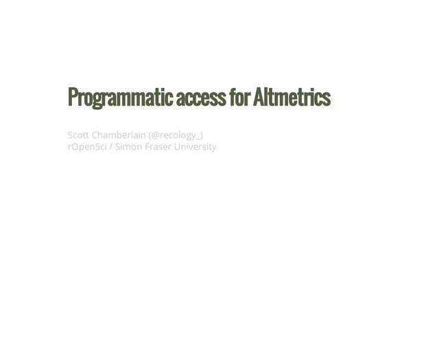data with a single function, and highlight inconsistencies p l o s _ d a t a < - a l m ( < d o i > ) i m p a c t s t o r y _ d a t a < - m e t r i c s ( < d o i > ) a l t m e t r i c _ d a t a < - a l t m e t r i c _ d a t a ( a l t m e t r i c s ( < d o i > ) ) a l t _ c o m b i n e ( p l o s _ d a t a , i m p a c t s t o r y _ d a t a , a l t m e t r i c _ d a t a ) W a r n i n g : I n c o n s i s t e n c y i n f a c e b o o k L i k e s , c h e c k m e t a d a t a d a t a S o u r c e f r o m P r o v i d e r v a l u e s 1 t w i t t e r P L O S A L M 1 0 0 2 f a c e b o o k L i k e s I m p a c t S t o r y 5 0 3 f a c e b o o k L i k e s A l t m e t r i c 4 0 4 s c o p u s C i t a t i o n s A l t m e t r i c 1 5 0 26/37