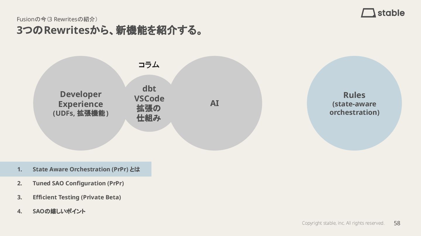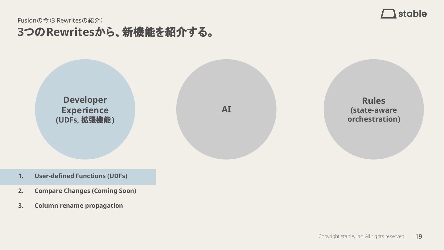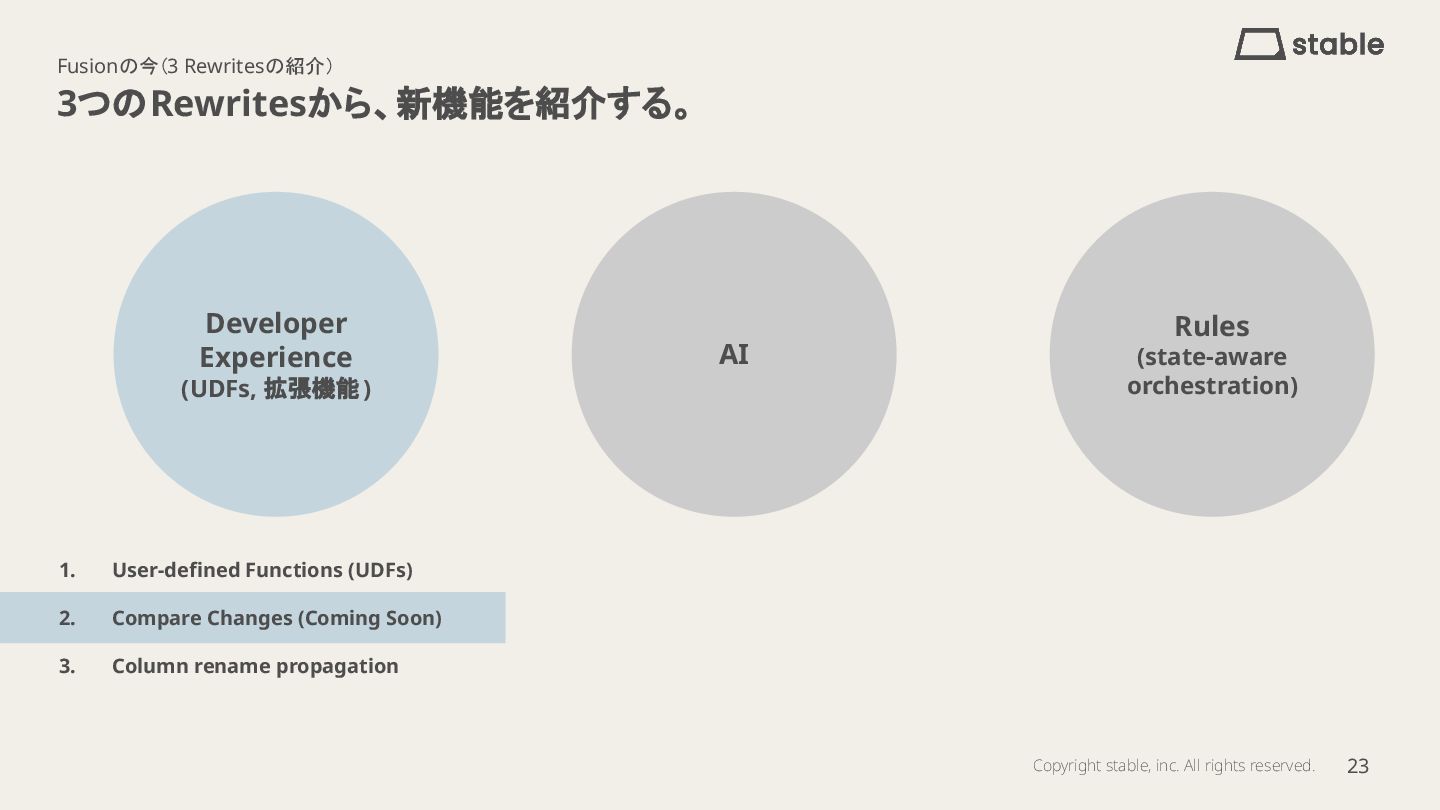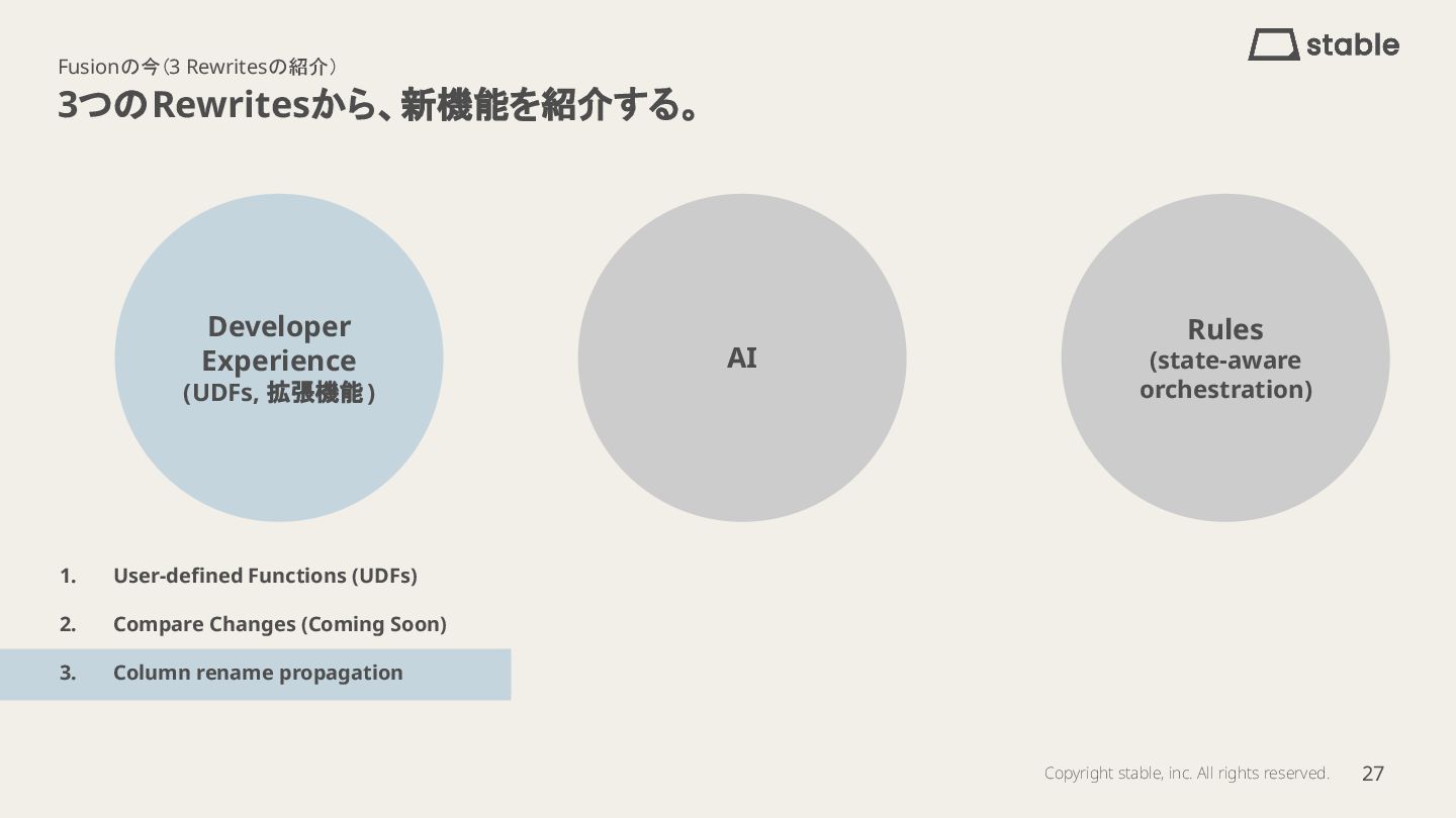 - Developer Experience (UDFs, 拡張機能): UDFsの安全な管理や、カラムリネームの自動反映など、ローカル開発の効率を劇的に向上させる機能 。