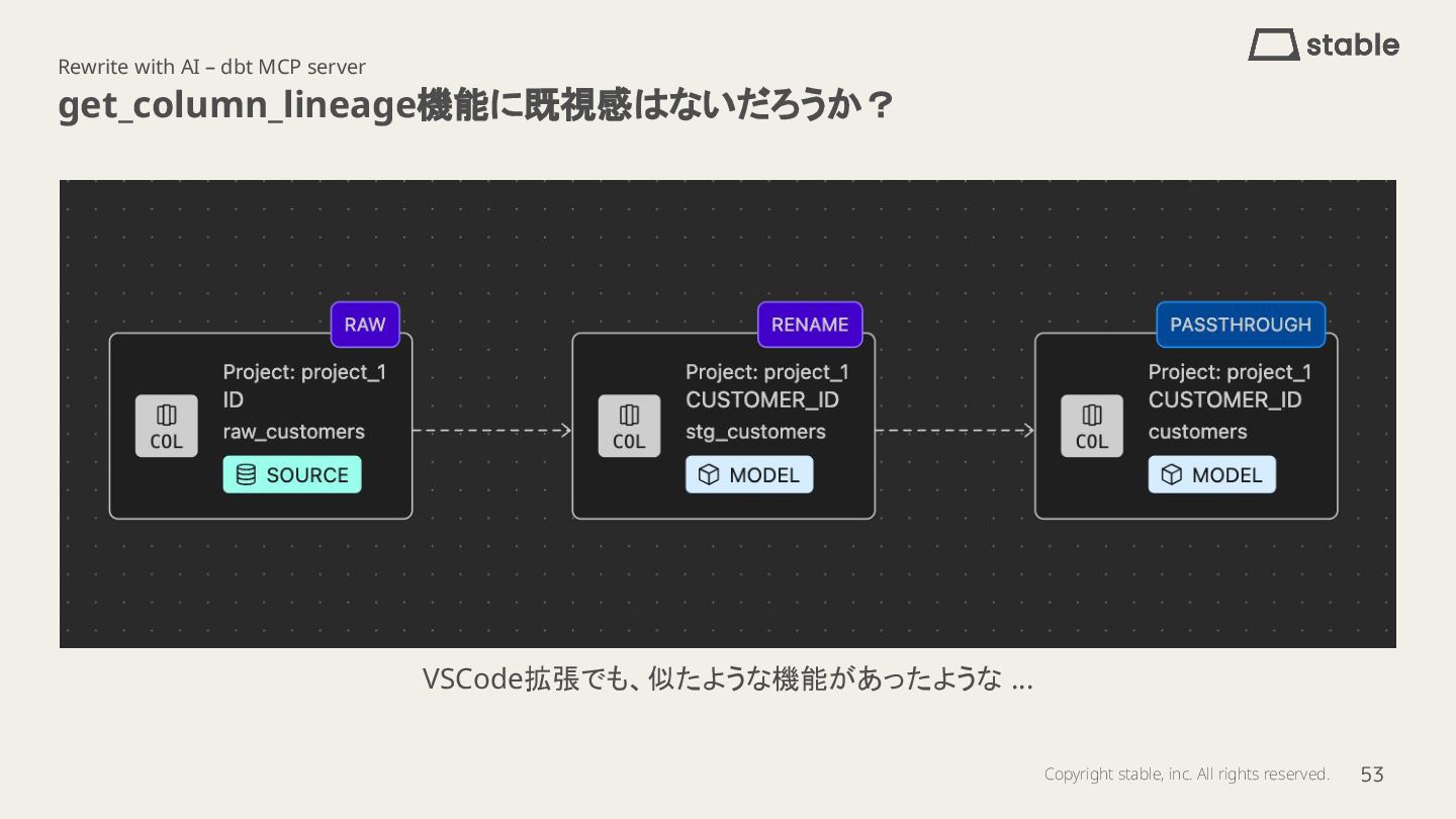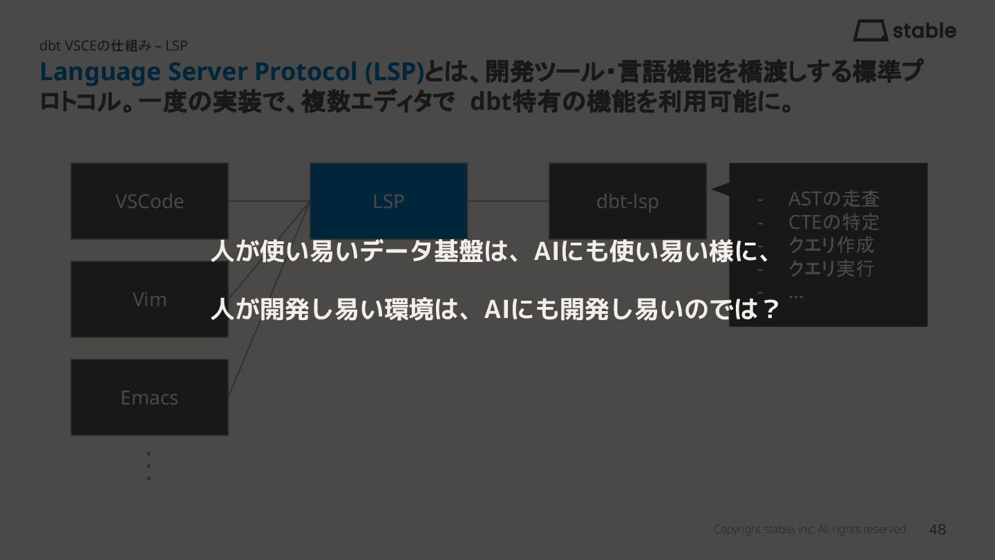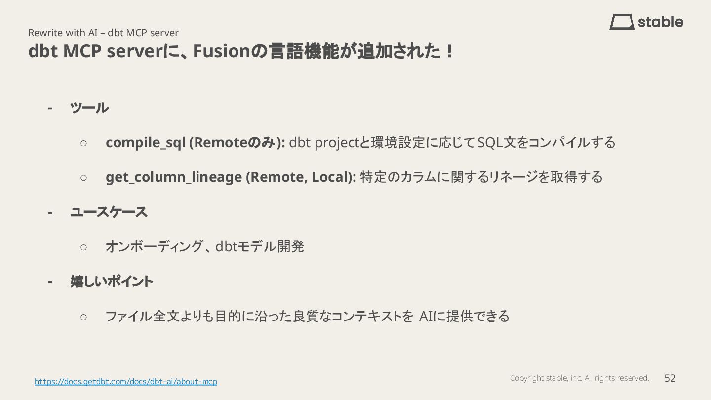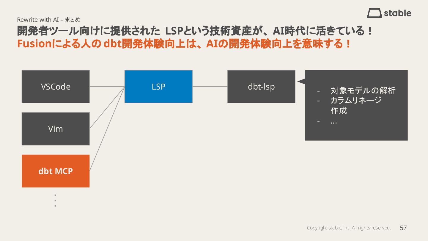 - Rewrite with AI (dbt MCP Server): 言語サーバープロトコル(LSP)の技術資産が、dbt MCP Serverを通じてAIエージェントの開発体験向上にも貢献している仕組み 。