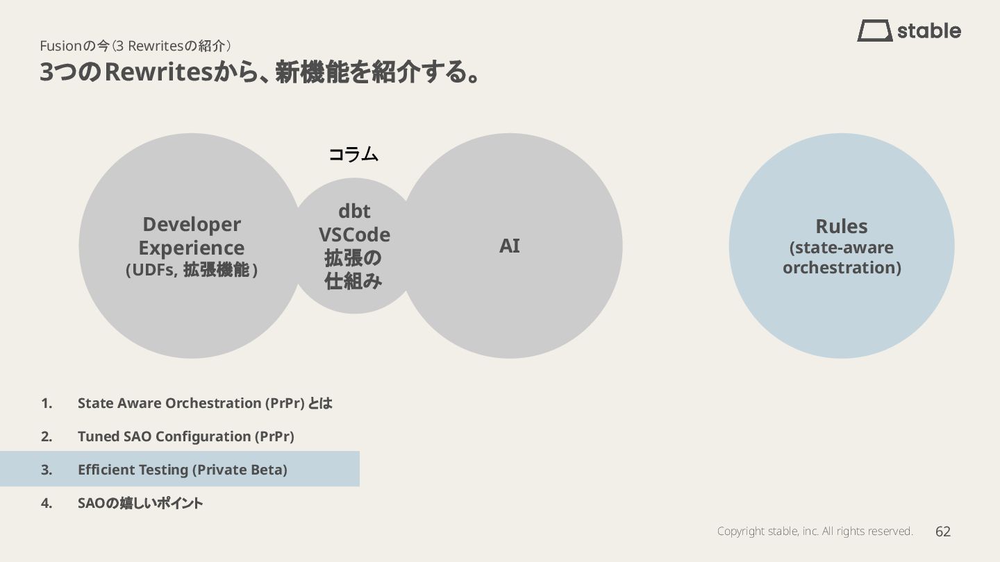 - Rewrite the Rules (State-aware orchestration, Efficient Testing): コードやデータの変更を検知してビルドを最適化するSAOや効率的なテスト機能による、コストと運用効率の改善(ベータ版では最大64%のコスト削減実績あり)。