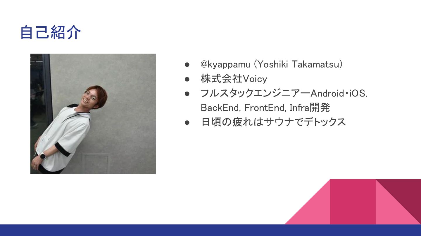 自己紹介 • @kyappamu (Yoshiki Takamatsu) • 株式会社Voicy • フルスタックエンジニアーAndroid・iOS, BackEnd,