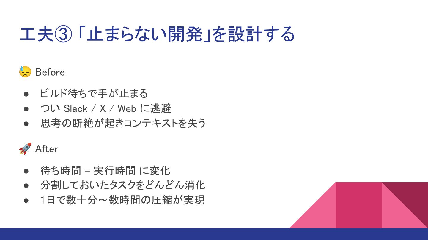 Web に逃避 • 思考の断絶が起きコンテキストを失う 🚀 After • 待ち時間 = 実行時間 に変化 • 分割しておいたタスクをどんどん消化 • 1日で数十分〜数時間の圧縮が実現 工夫③ 「止まらない開発」を設計する