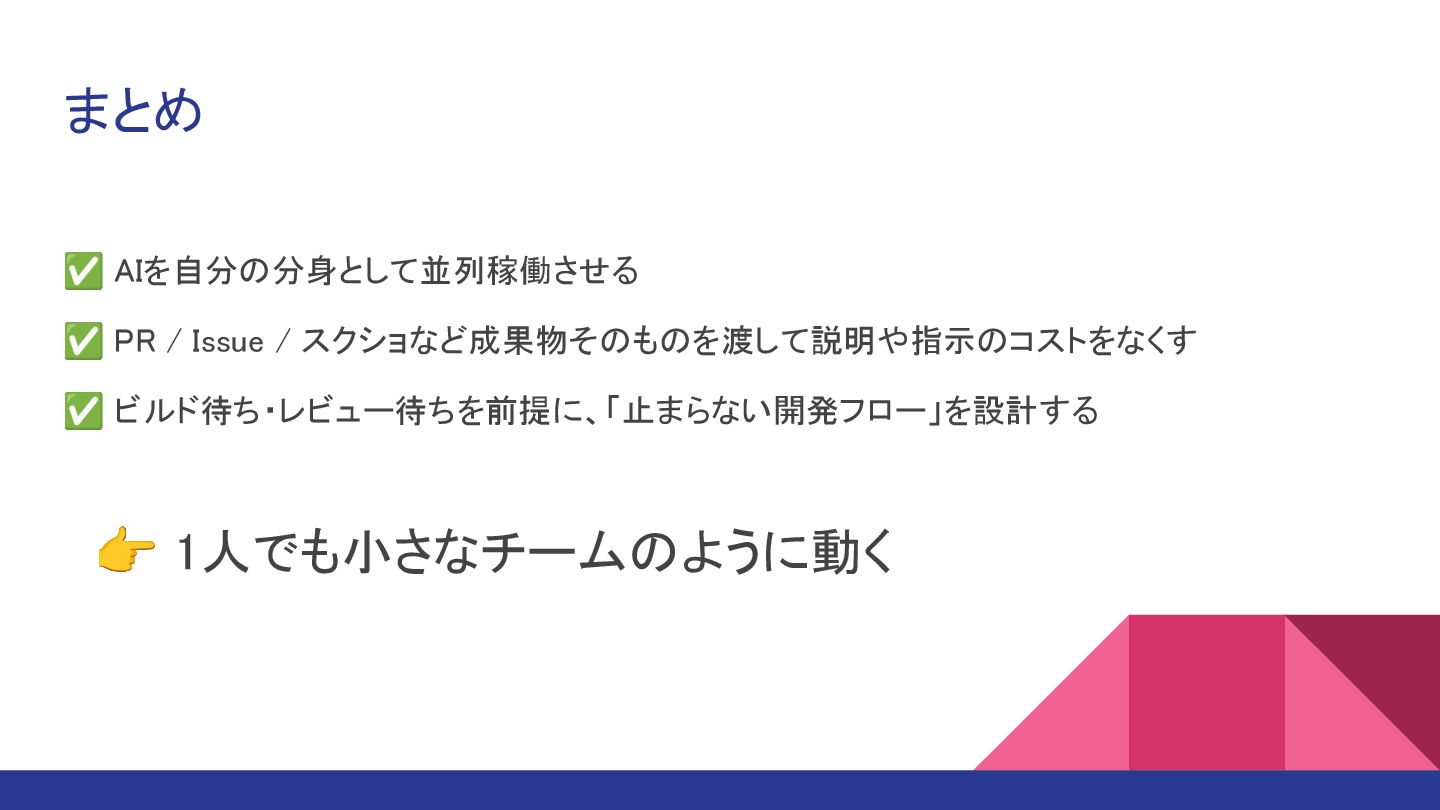 まとめ ✅ AIを自分の分身として並列稼働させる ✅ PR / Issue / スクショなど成果物そのものを渡して説明や指示のコストをなくす