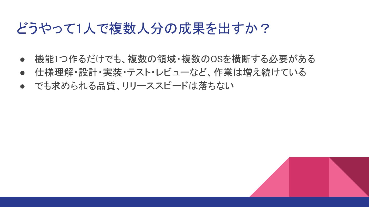 どうやって1人で複数人分の成果を出すか? • 機能1つ作るだけでも、複数の領域・複数のOSを横断する必要がある • 仕様理解・設計・実装・テスト・レビューなど、作業は増え続けている • でも求められる品質、リリーススピードは落ちない