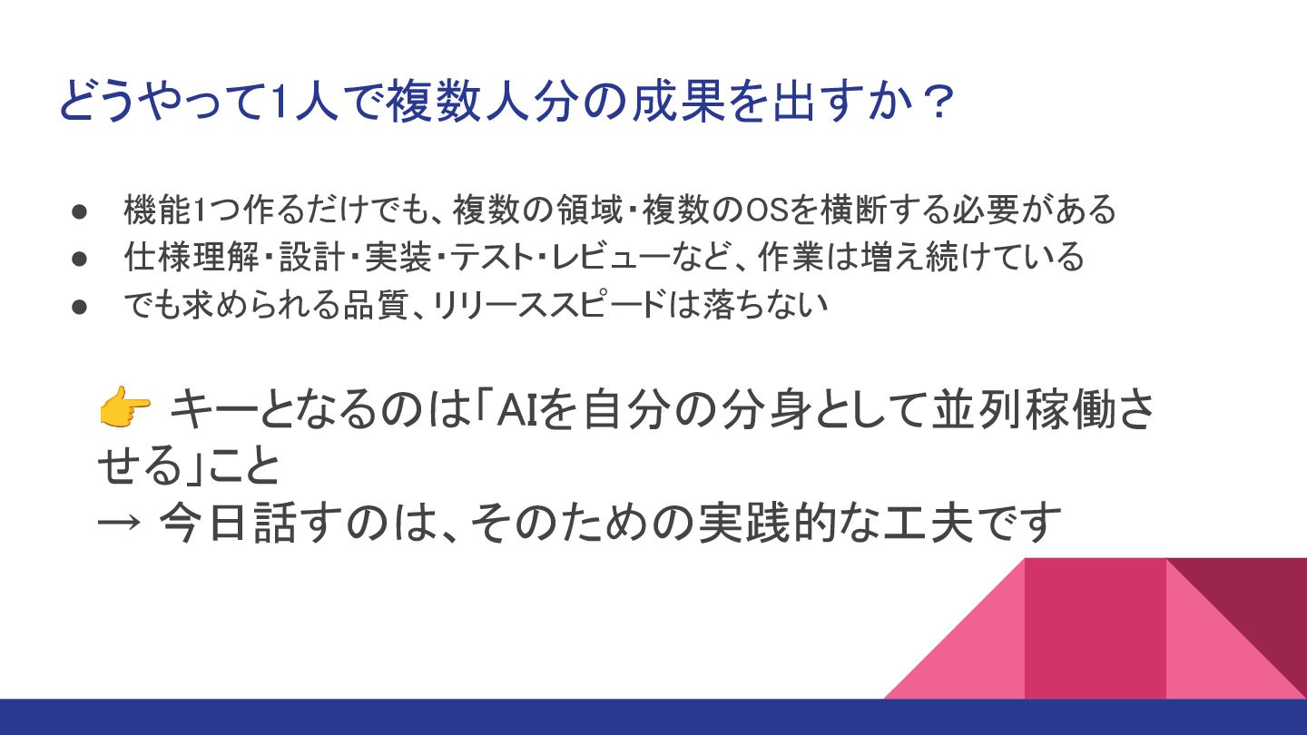 👉 キーとなるのは「AIを自分の分身として並列稼働さ せる」こと → 今日話すのは、そのための実践的な工夫です どうやって1人で複数人分の成果を出すか? • 機能1つ作るだけでも、複数の領域・複数のOSを横断する必要がある •