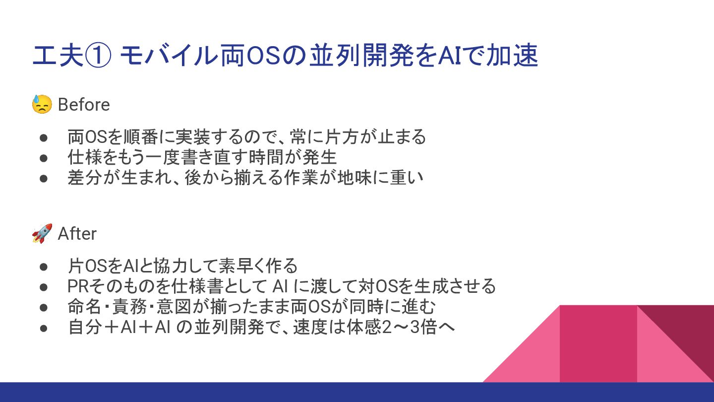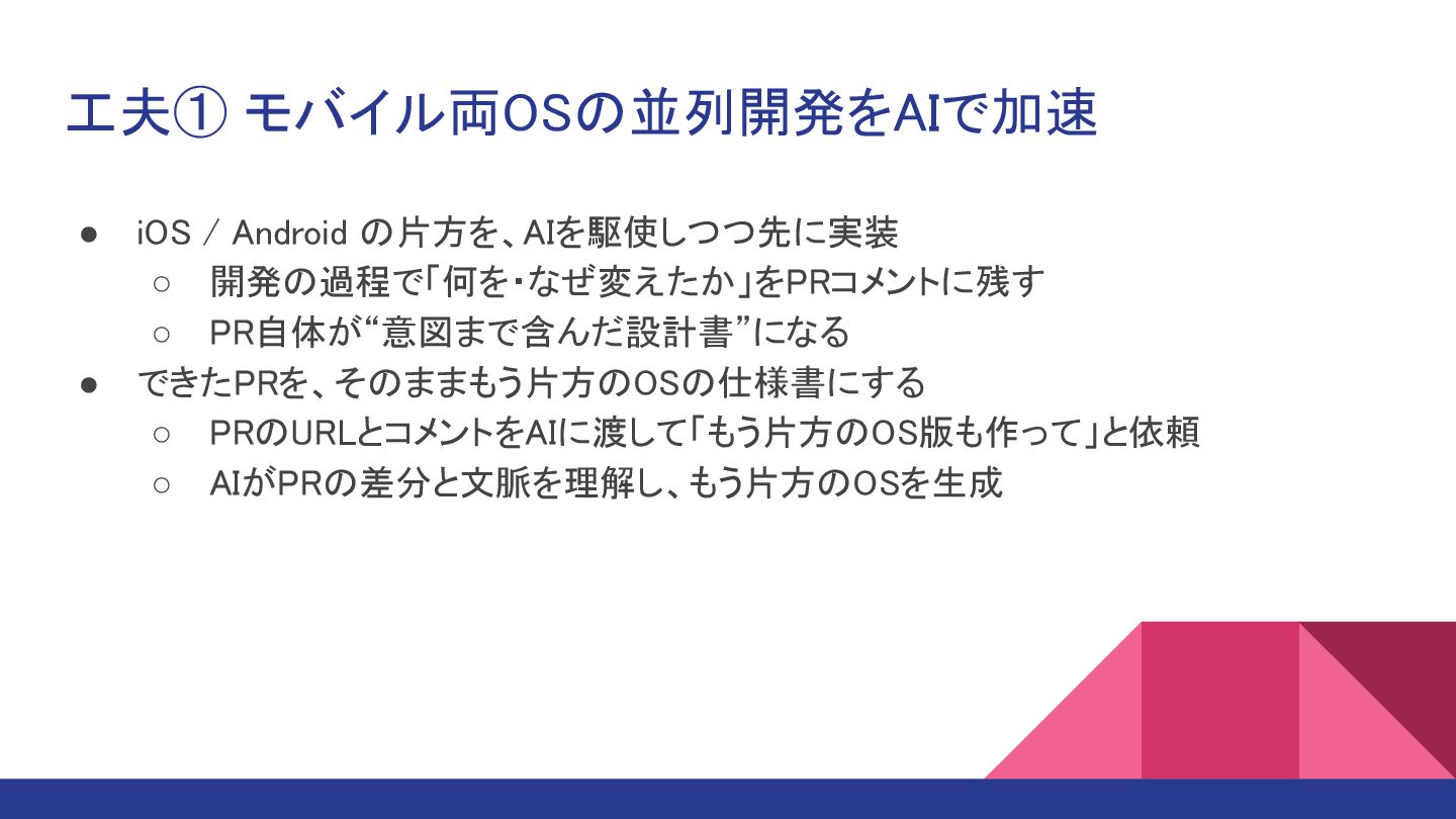 工夫① モバイル両OSの並列開発をAIで加速 • iOS / Android の片方を、AIを駆使しつつ先に実装 ◦ 開発の過程で「何を・なぜ変えたか」をPRコメントに残す ◦