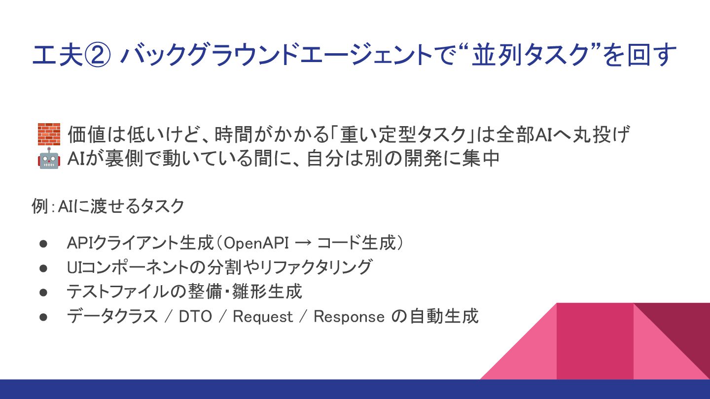 工夫② バックグラウンドエージェントで“並列タスク”を回す 🧱 価値は低いけど、時間がかかる「重い定型タスク」は全部AIへ丸投げ 🤖 AIが裏側で動いている間に、自分は別の開発に集中 例:AIに渡せるタスク • APIクライアント生成(OpenAPI