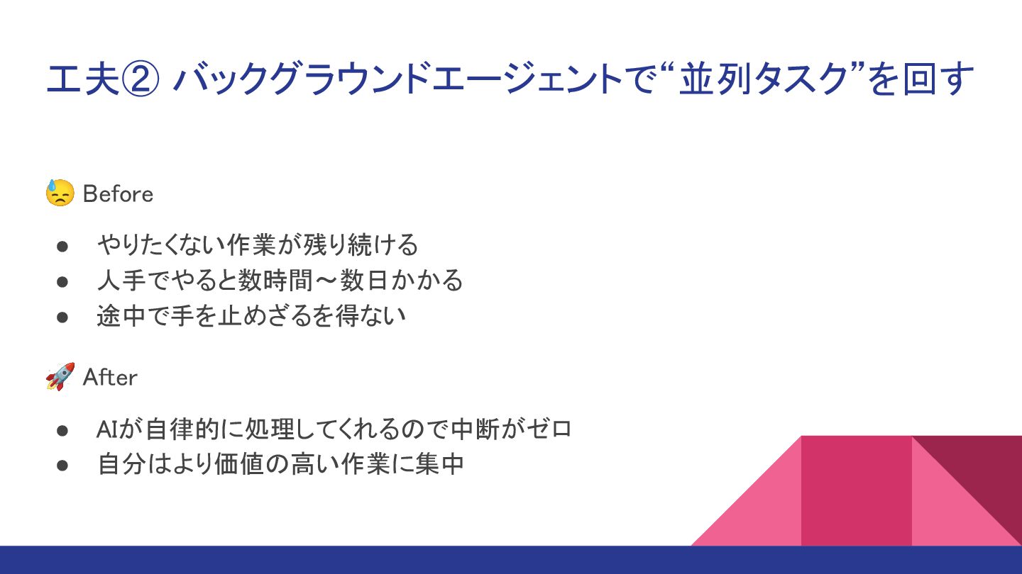 • AIが自律的に処理してくれるので中断がゼロ • 自分はより価値の高い作業に集中 工夫② バックグラウンドエージェントで“並列タスク”を回す