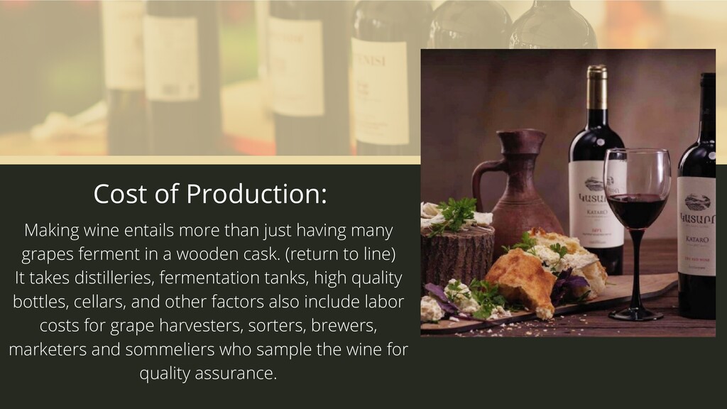 many grapes ferment in a wooden cask. (return to line) It takes distilleries, fermentation tanks, high quality bottles, cellars, and other factors also include labor costs for grape harvesters, sorters, brewers, marketers and sommeliers who sample the wine for quality assurance.