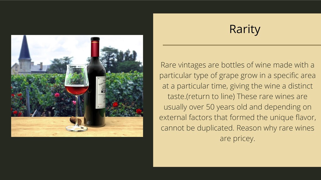 particular type of grape grow in a specific area at a particular time, giving the wine a distinct taste.(return to line) These rare wines are usually over 50 years old and depending on external factors that formed the unique flavor, cannot be duplicated. Reason why rare wines are pricey.