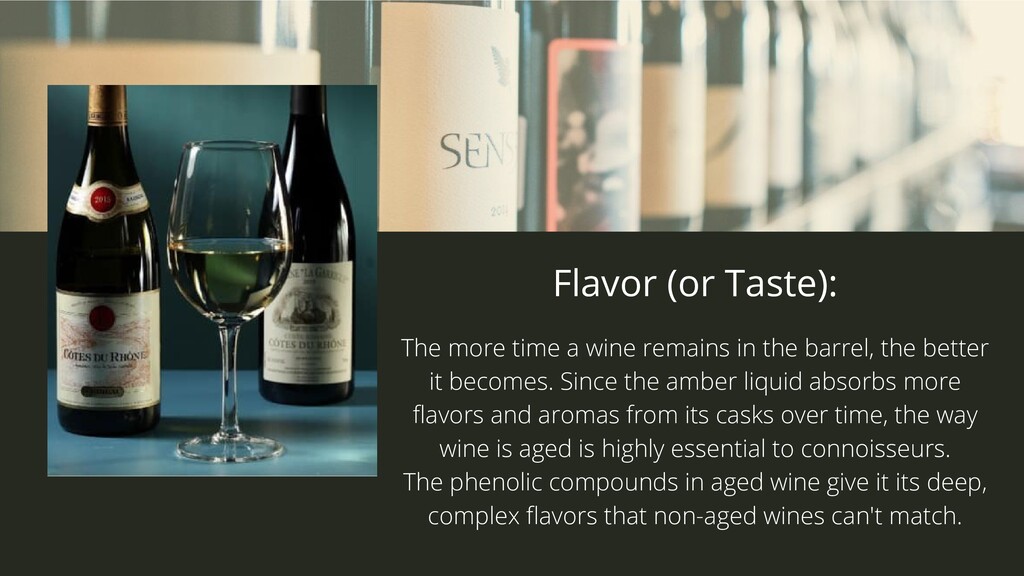 the barrel, the better it becomes. Since the amber liquid absorbs more flavors and aromas from its casks over time, the way wine is aged is highly essential to connoisseurs. The phenolic compounds in aged wine give it its deep, complex flavors that non-aged wines can't match.