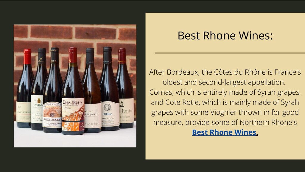 second-largest appellation. Cornas, which is entirely made of Syrah grapes, and Cote Rotie, which is mainly made of Syrah grapes with some Viognier thrown in for good measure, provide some of Northern Rhone's Best Rhone Wines. Best Rhone Wines: