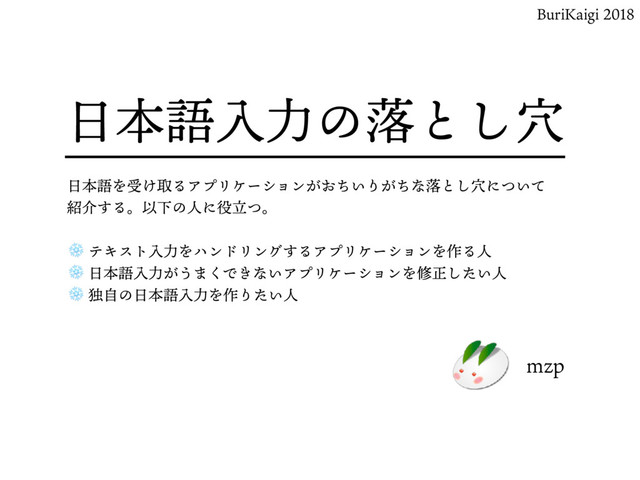 - テキスト入力をハンドリングするアプリケーションを作る人 - 日本語入力がうまくできないアプリケーションを修正したい人 - 独自の日本語入力を作りたい人