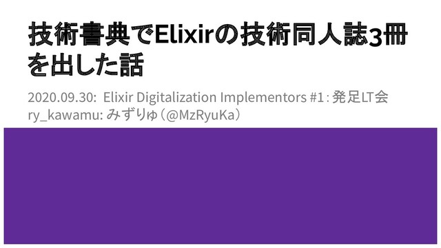 技術書典でElixirの技術同人誌3冊 を出した話 2020.09.30: Elixir Digitalization Implementors #1:発足LT会 ry_kawamu: みずりゅ(@MzRyuKa)