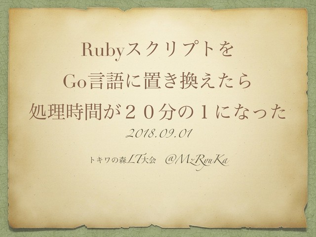 RubyεΫϦϓτΛ Goݴޠʹஔ͖͑ͨΒ ॲཧ͕࣌ؒ̎̌ͷ̍ʹͳͬͨ 2018.09.01 τΩϫͷLTେձ @MzRyuKa