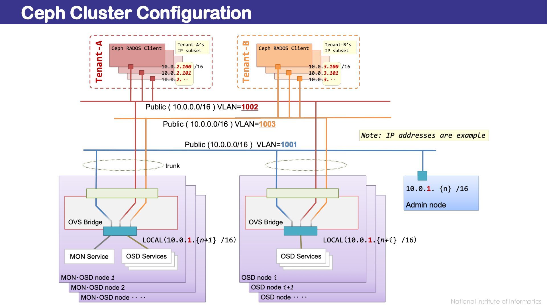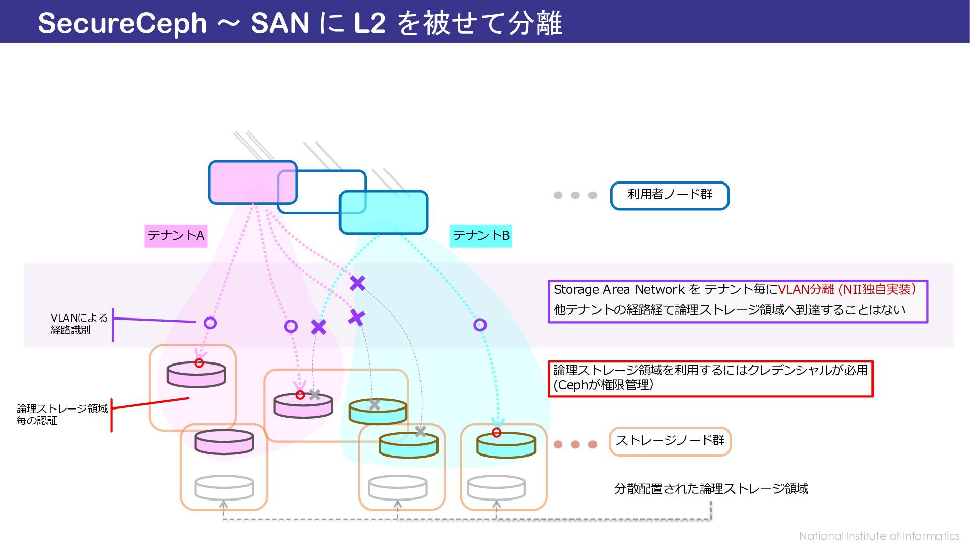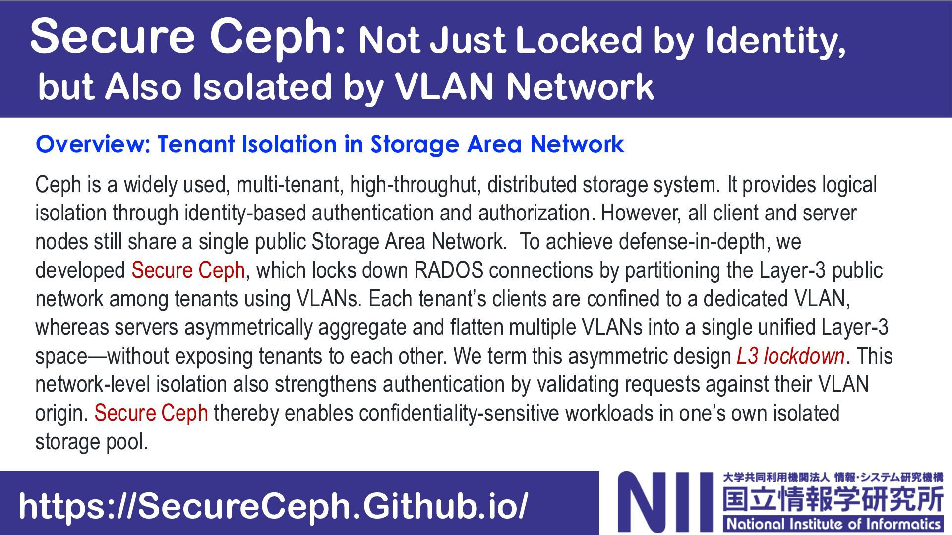 Identity, but Also Isolated by VLAN Network Overview: Tenant Isolation in Storage Area Network Ceph is a widely used, multi-tenant, high-throughut, distributed storage system. It provides logical isolation through identity-based authentication and authorization. However, all client and server nodes still share a single public Storage Area Network. To achieve defense-in-depth, we developed Secure Ceph, which locks down RADOS connections by partitioning the Layer-3 public network among tenants using VLANs. Each tenant’s clients are confined to a dedicated VLAN, whereas servers asymmetrically aggregate and flatten multiple VLANs into a single unified Layer-3 space—without exposing tenants to each other. We term this asymmetric design L3 lockdown. This network-level isolation also strengthens authentication by validating requests against their VLAN origin. Secure Ceph thereby enables confidentiality-sensitive workloads in one’s own isolated storage pool. https://SecureCeph.Github.io/