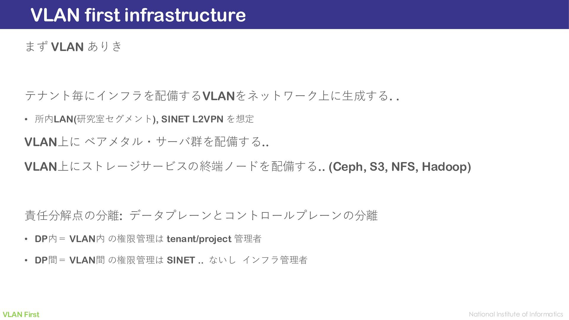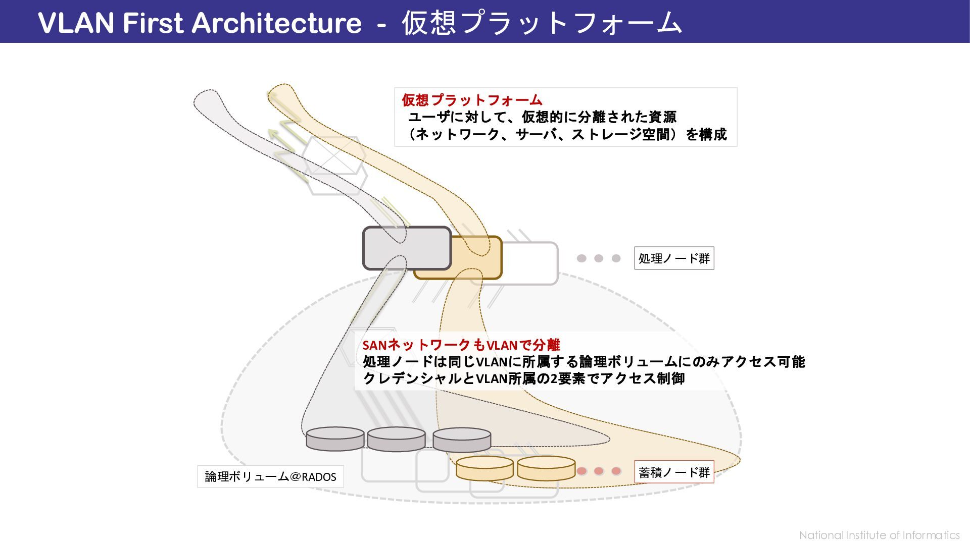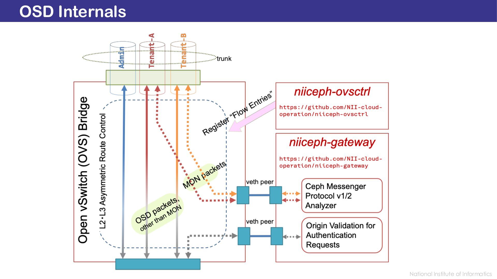 Identity, but Also Isolated by VLAN Network Overview: Tenant Isolation in Storage Area Network Ceph is a widely used, multi-tenant, high-throughut, distributed storage system. It provides logical isolation through identity-based authentication and authorization. However, all client and server nodes still share a single public Storage Area Network. To achieve defense-in-depth, we developed Secure Ceph, which locks down RADOS connections by partitioning the Layer-3 public network among tenants using VLANs. Each tenant’s clients are confined to a dedicated VLAN, whereas servers asymmetrically aggregate and flatten multiple VLANs into a single unified Layer-3 space—without exposing tenants to each other. We term this asymmetric design L3 lockdown. This network-level isolation also strengthens authentication by validating requests against their VLAN origin. Secure Ceph thereby enables confidentiality-sensitive workloads in one’s own isolated storage pool. https://SecureCeph.Github.io/