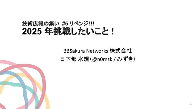 年度予算確保のため計画検討中 • (個人的な思い) SNS に対するスタンスを定めたい • 平和じゃなくなってしまった X との付き合い方 • トランプの圧力に屈する Facebook との付き合い方 • 使いたい SNS で見てもらえる・親しんでもらえる発信方法の模索 2025 年挑戦したいこと! 昨年のスポンサー実績 : 1 件 - Cloud Operator Days Tokyo 他いくつかのイベントのスポンサーを検討したが、金 額・稼動の問題で実施できず 昨年の SNS の使い方: - X, Facebook, Bluesky を継続利用 - 流行りに乗って mixi2 も運用開始したが終了 する方向