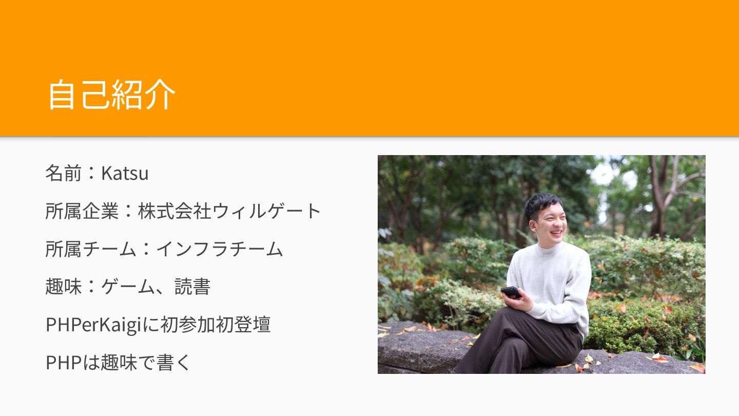 ⾃⼰紹介 名前:Katsu 所属企業:株式会社ウィルゲート 所属チーム:インフラチーム 趣味:ゲーム、読書 PHPerKaigiに初参加初登壇 PHPは趣味で書く