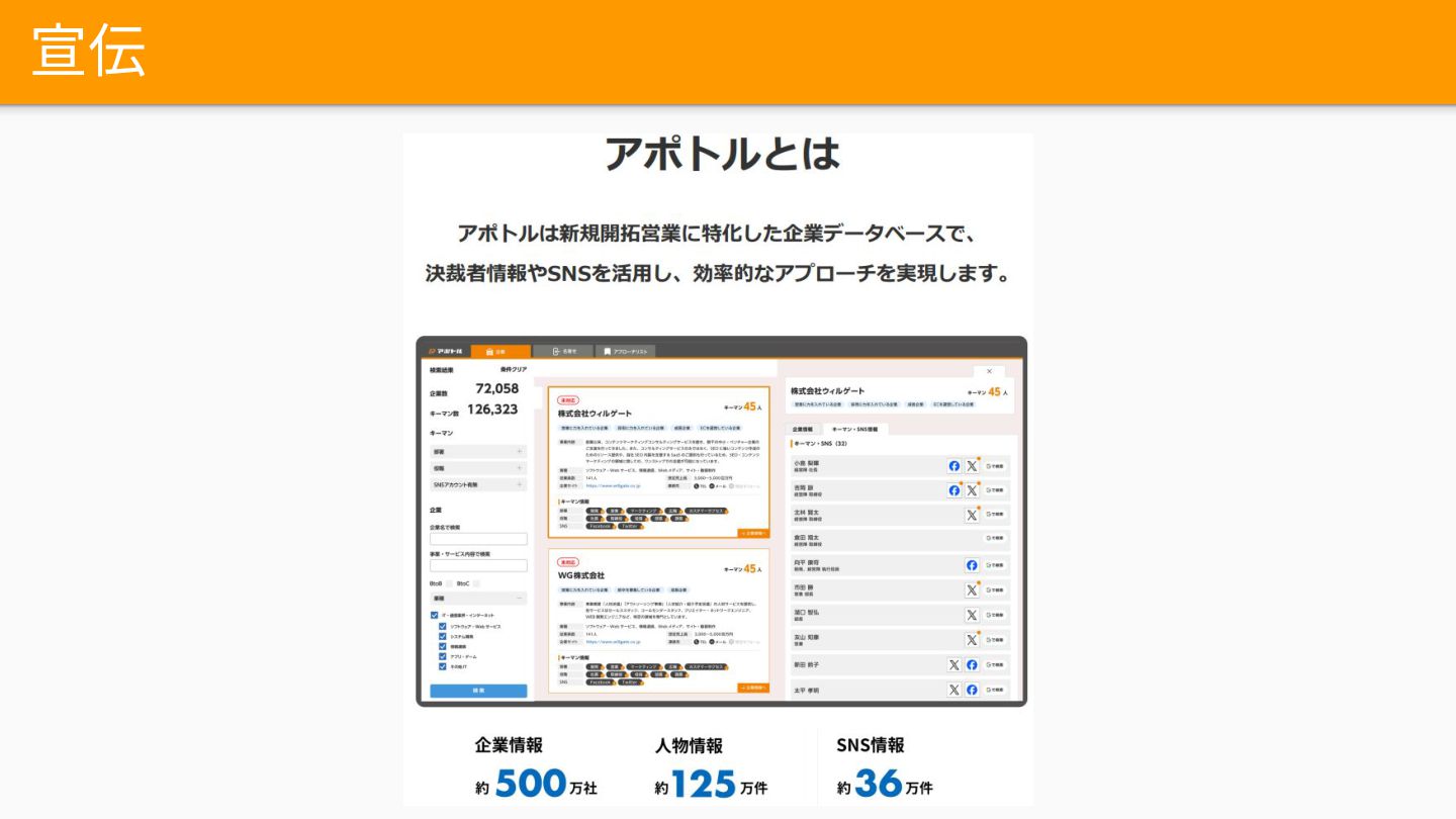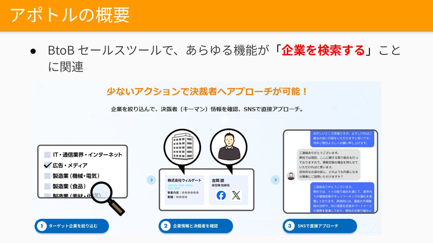 アポトルの概要 • BtoB セールスツールで、あらゆる機能が「企業を検索する」こと に関連