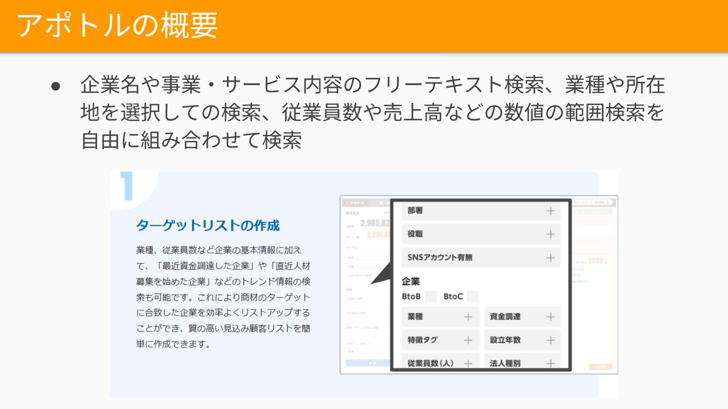 アポトルの概要 • 企業名や事業‧サービス内容のフリーテキスト検索、業種や所在 地を選択しての検索、従業員数や売上⾼などの数値の範囲検索を ⾃由に組み合わせて検索