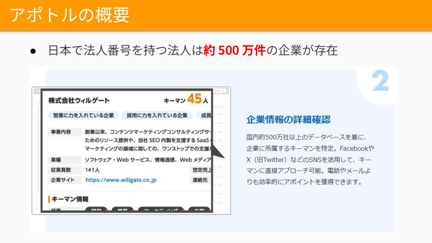アポトルの概要 • ⽇本で法⼈番号を持つ法⼈は約 500 万件の企業が存在