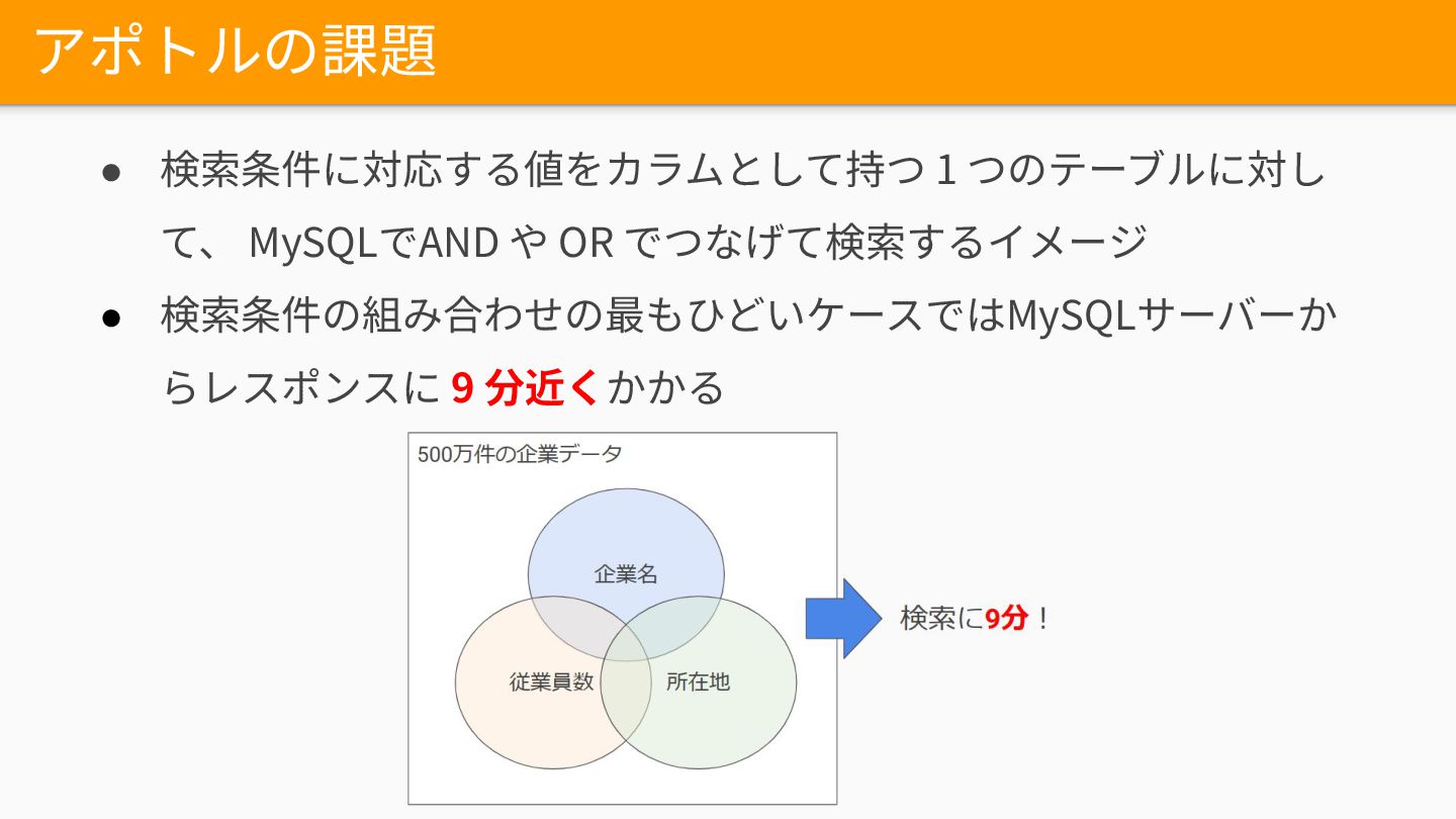アポトルの課題 • 検索条件に対応する値をカラムとして持つ 1 つのテーブルに対し て、 MySQLでAND や OR でつなげて検索するイメージ