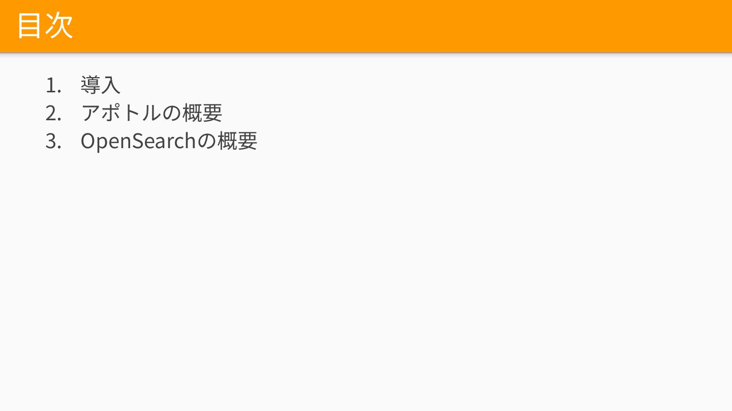 ⽬次 1. 導⼊ 2. アポトルの概要 3. OpenSearchの概要