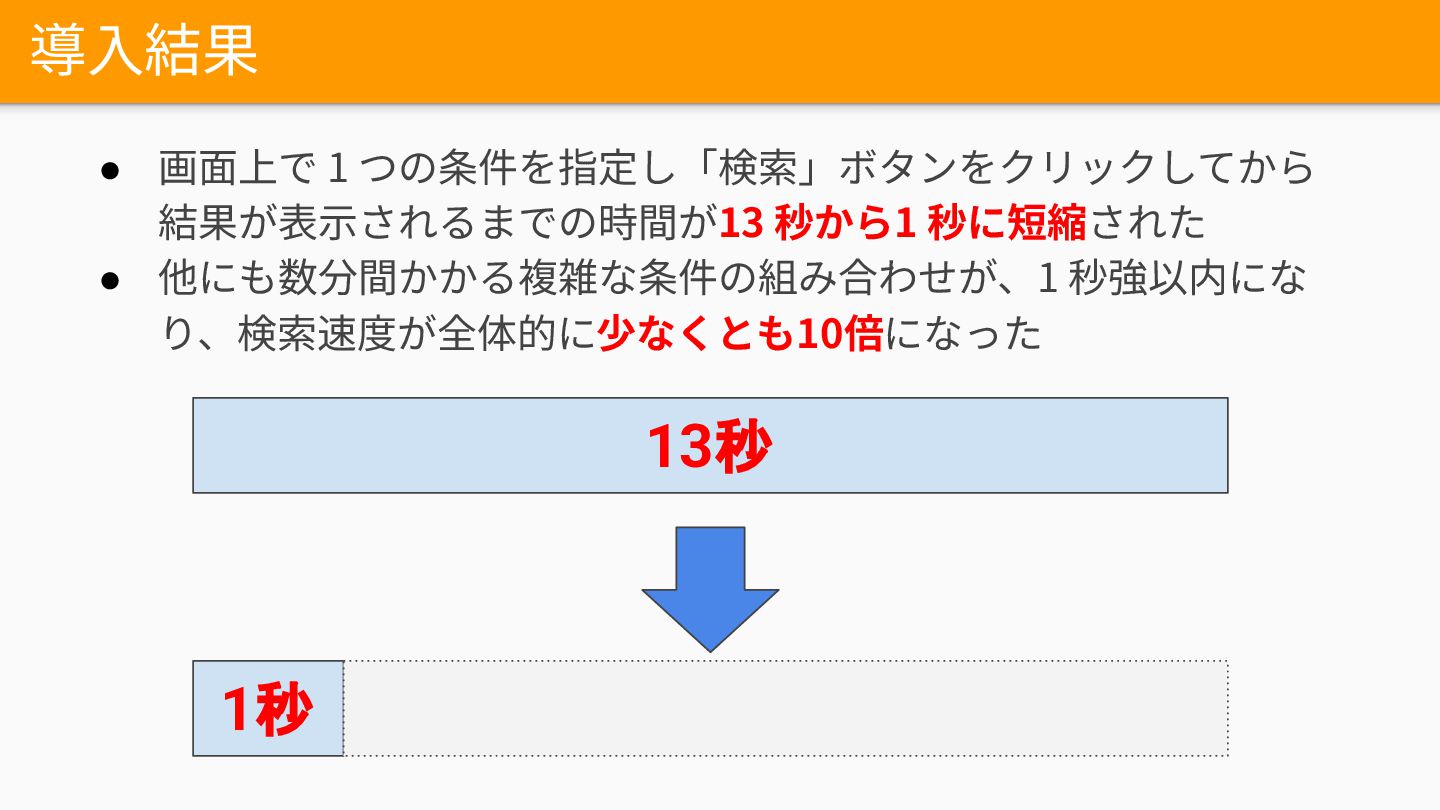 導⼊結果 • 画⾯上で 1 つの条件を指定し「検索」ボタンをクリックしてから 結果が表⽰されるまでの時間が13 秒から1 秒に短縮された • 他にも数分間かかる複雑な条件の組み合わせが、1