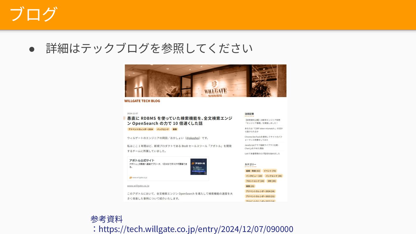 ブログ • 詳細はテックブログを参照してください 参考資料 :https://tech.willgate.co.jp/entry/2024/12/07/090000