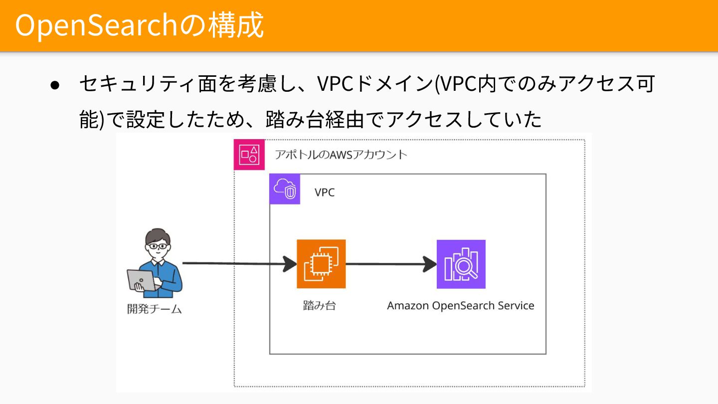 OpenSearchの構成 • セキュリティ⾯を考慮し、VPCドメイン(VPC内でのみアクセス可 能)で設定したため、踏み台経由でアクセスしていた