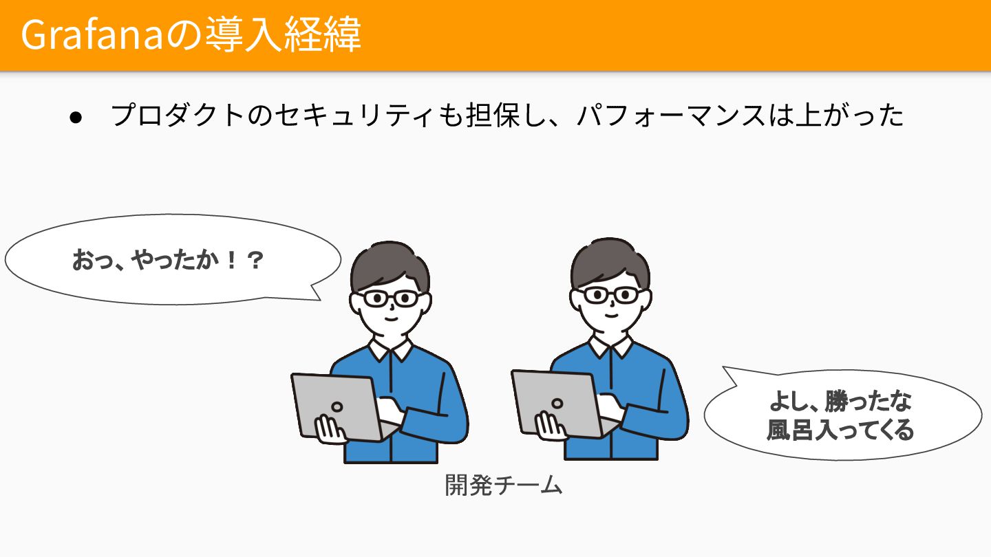Grafanaの導⼊経緯 • プロダクトのセキュリティも担保し、パフォーマンスは上がった 開発チーム おっ、やったか!? よし、勝ったな 風呂入ってくる