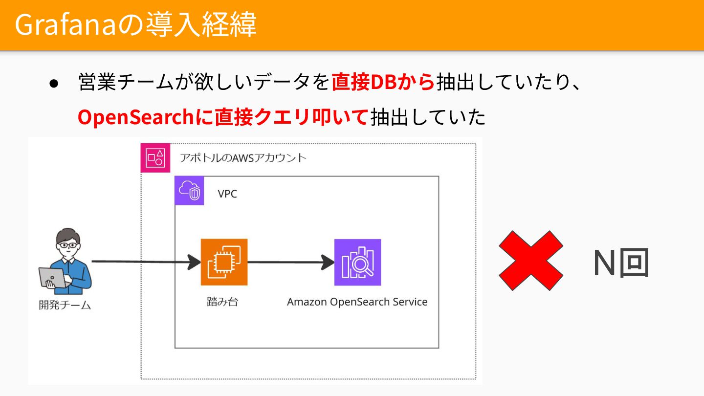 Grafanaの導⼊経緯 • 営業チームが欲しいデータを直接DBから抽出していたり、 OpenSearchに直接クエリ叩いて抽出していた N回