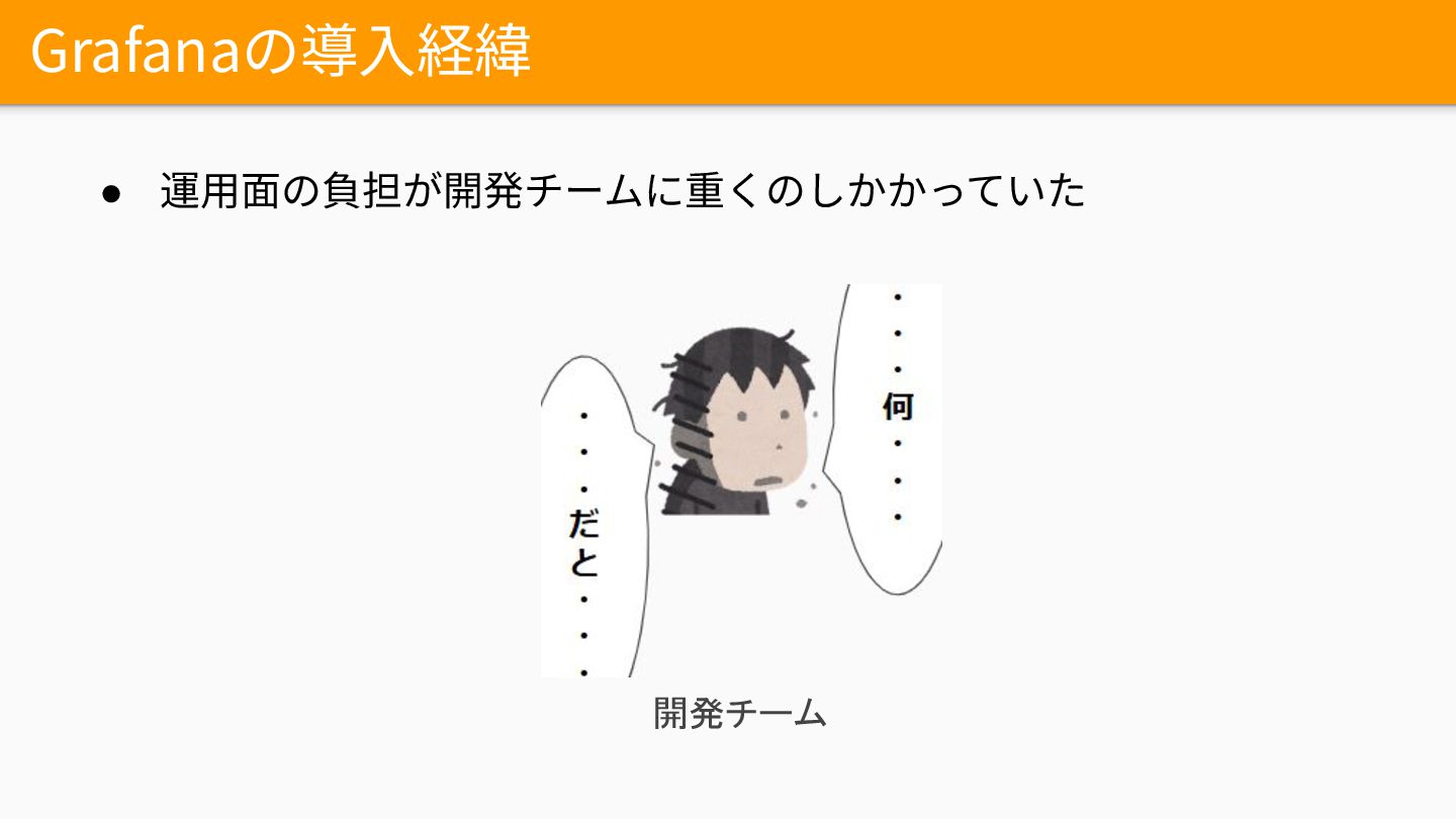 Grafanaの導⼊経緯 • 運⽤⾯の負担が開発チームに重くのしかかっていた 開発チーム
