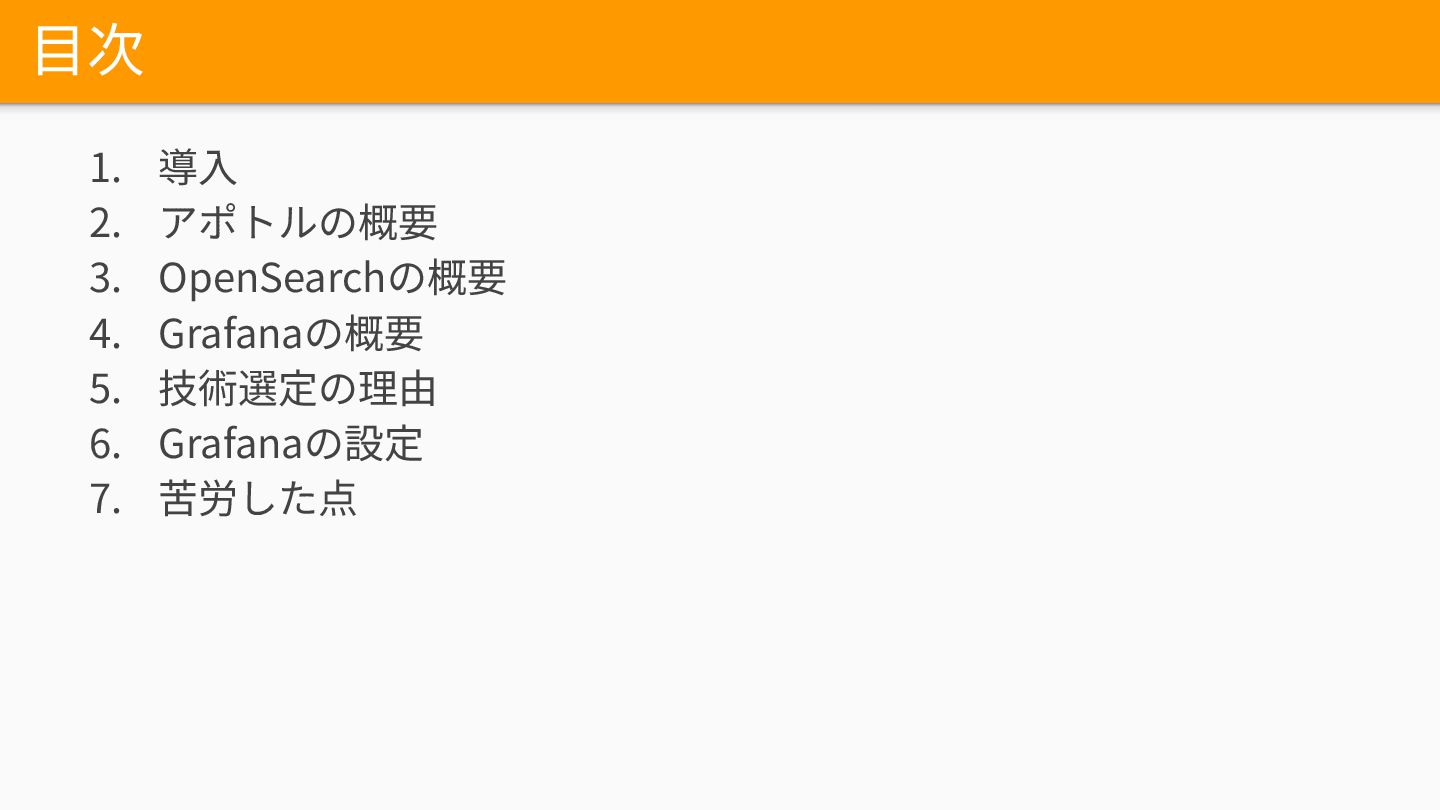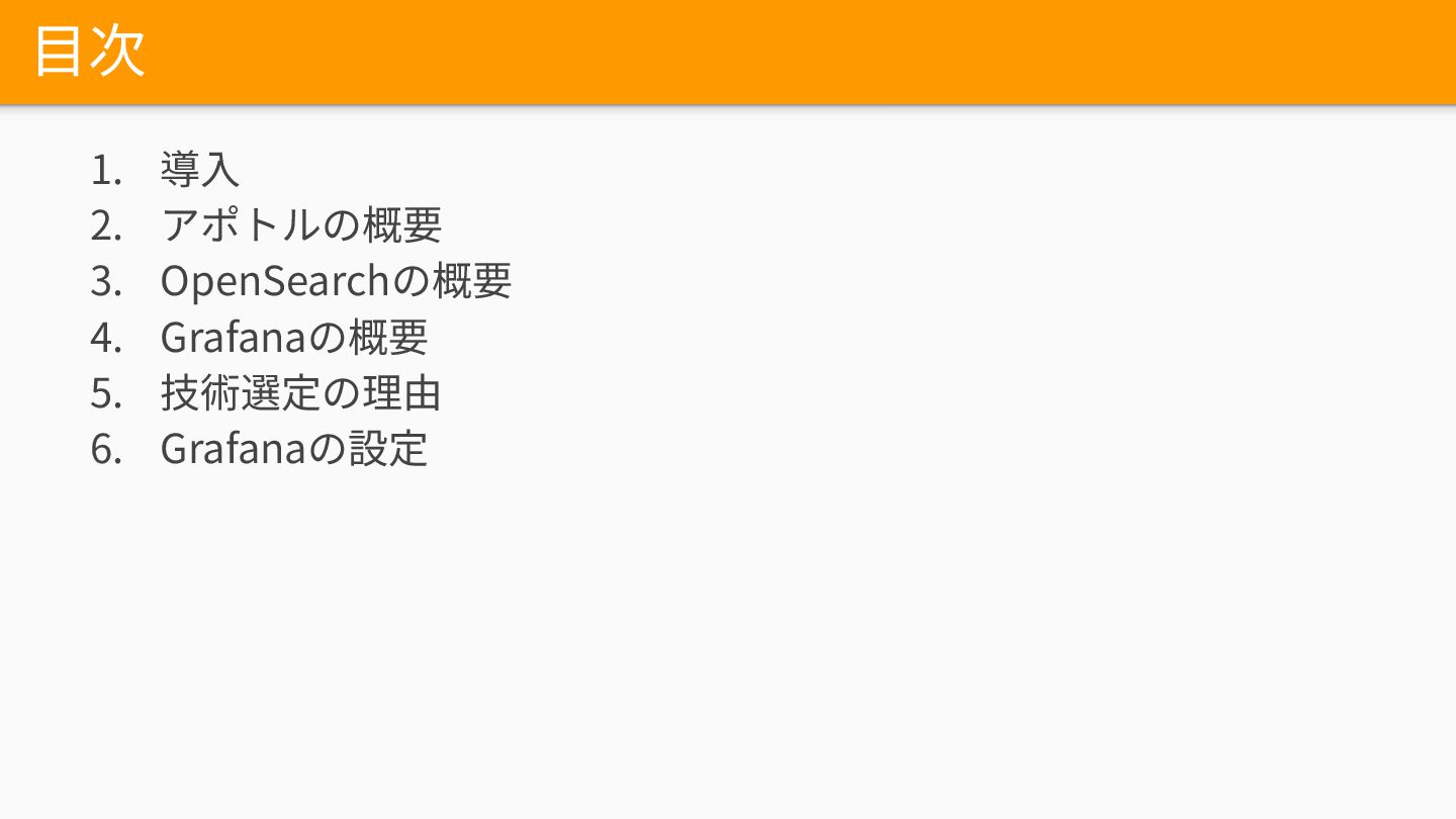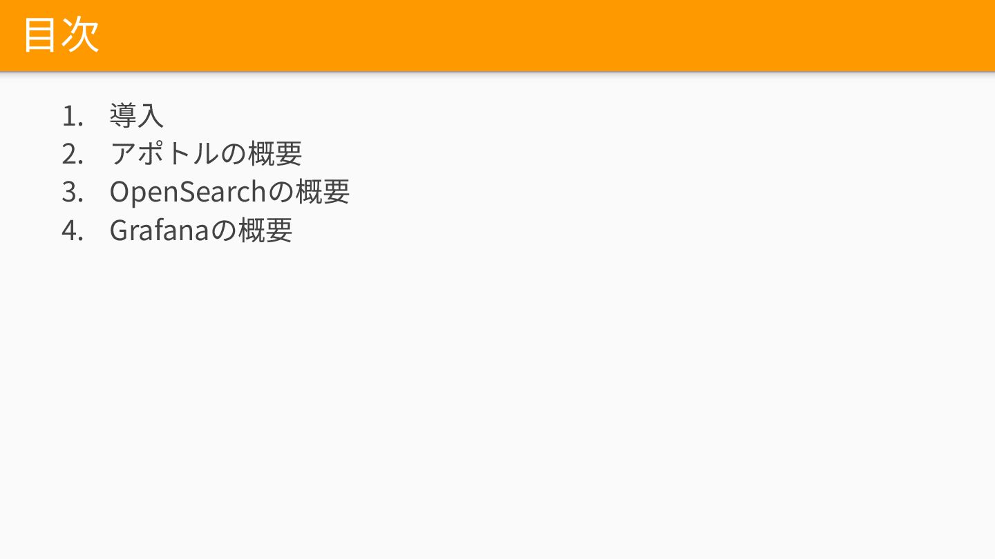 ⽬次 1. 導⼊ 2. アポトルの概要 3. OpenSearchの概要 4. Grafanaの概要 5.